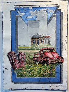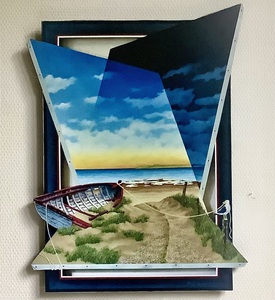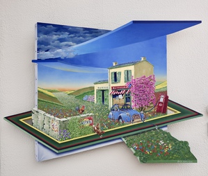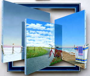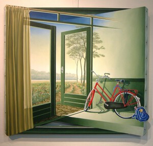 Eric Kerkvliet schildert met olieverf uiterst gedetailleerd voorstellingen op iets verhoogd paneel waardoor bij juiste belichting een Trompe-l’oeil-achtig effect ontstaat.