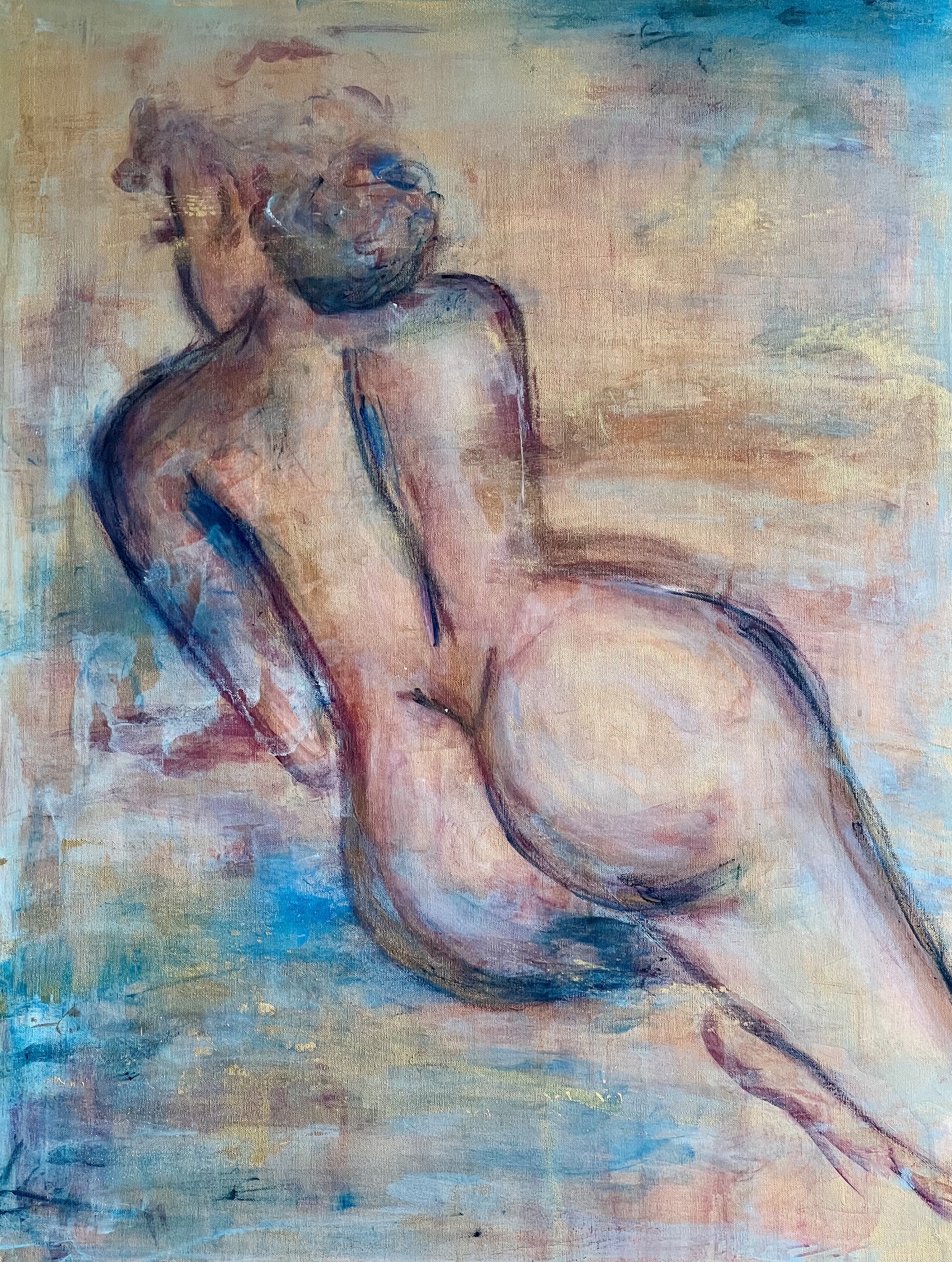 Geschilderd naar een voorbeeld van een eigen modeltekening, gouden ondergrond, mix van acryl en oliepastel.