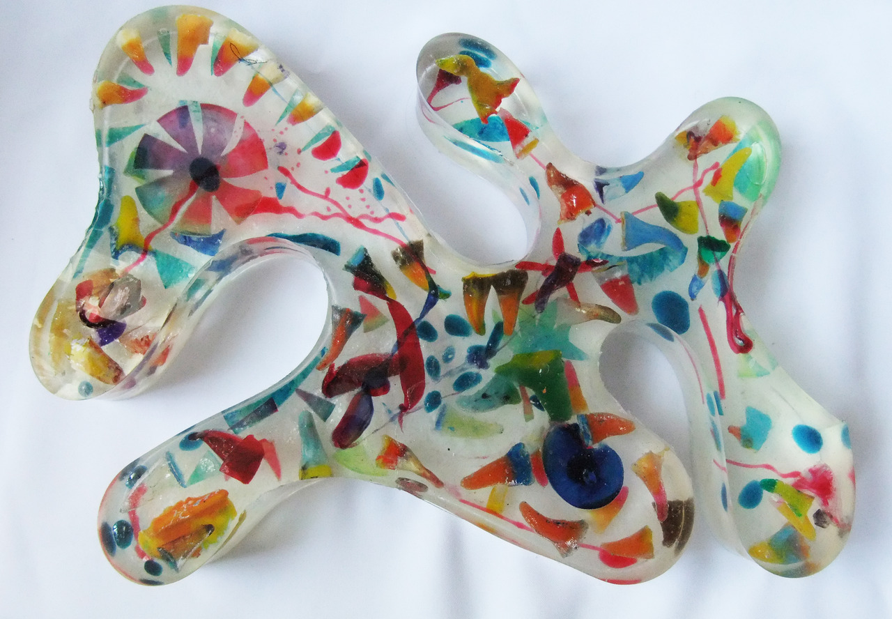 Werken met PLA ( 3dprint afval) werken van giethars met pigmenten op doek Giethars objecten