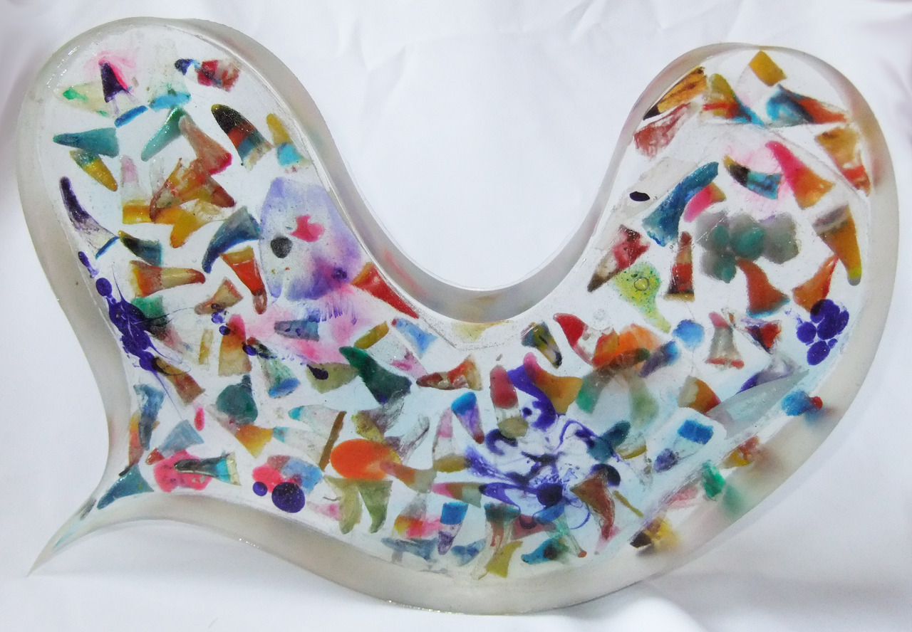 Helder goethars met ingegoten voorwerpjes en pigmenten Dit object kan in verschillende posities neergezet worden. Dit object is opnieuw ingegoten in een nieuw object. Daardoor ontsaat een dubbele rand en (aan 1 kant) een heleboel zeer kleine luchtbelltetjes. Zwaar en massief stuk gemaakt van topkwalitiet epoxy. gewicht 4 a 5 kg. grootte 37 x 29 x 5 cm onbewerkt uit de mal. scheroe randjes etc. mogelijk !