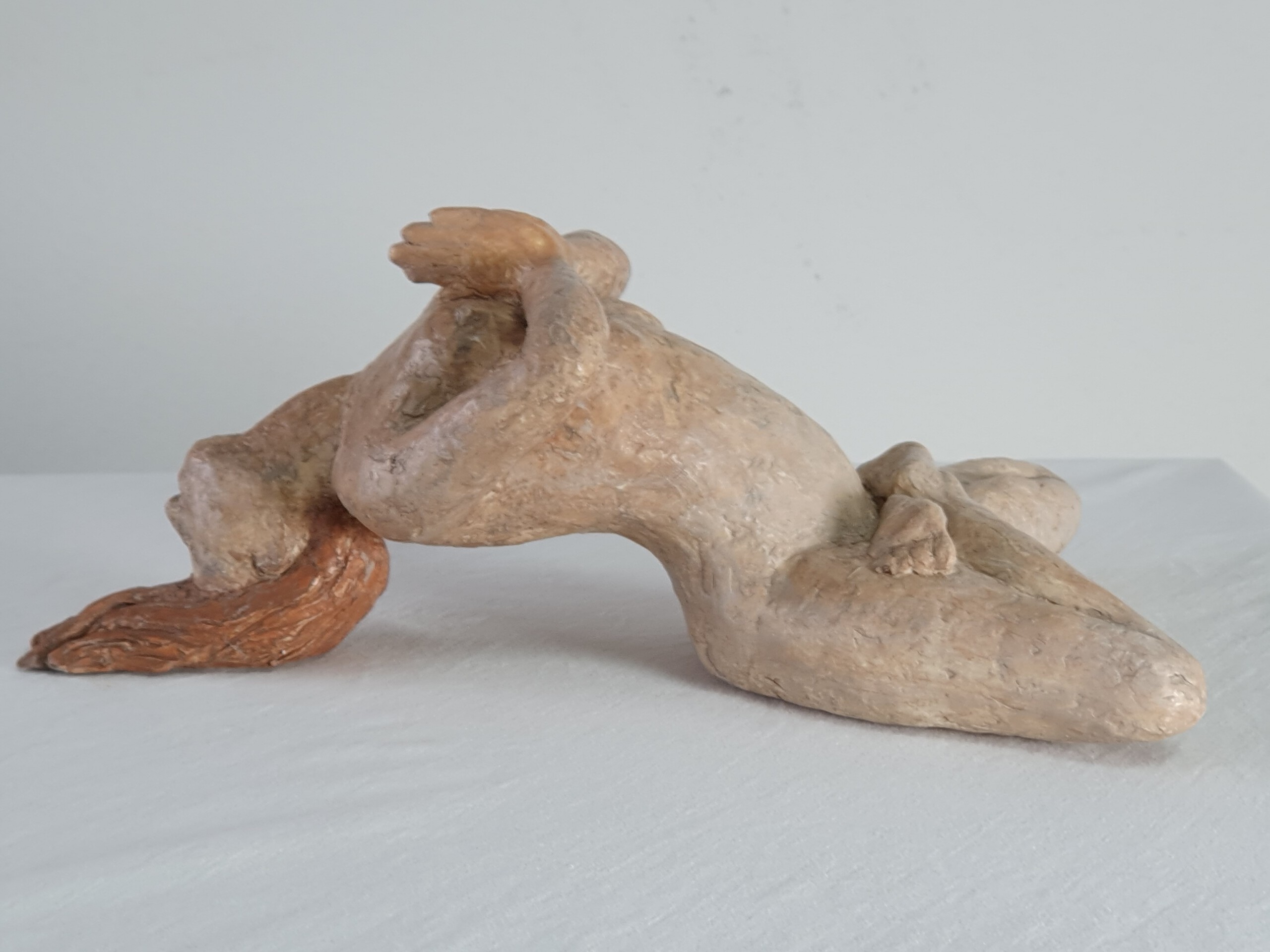 Marlin, de vissenvrouw, beweegt met haar benen als een staart en haar armen als vinnen, soepel door het water. Kunsthars gepatineerd in beige/camel of roodbruin/ hazelnoot. Beperkte oplage en gesigneerd.