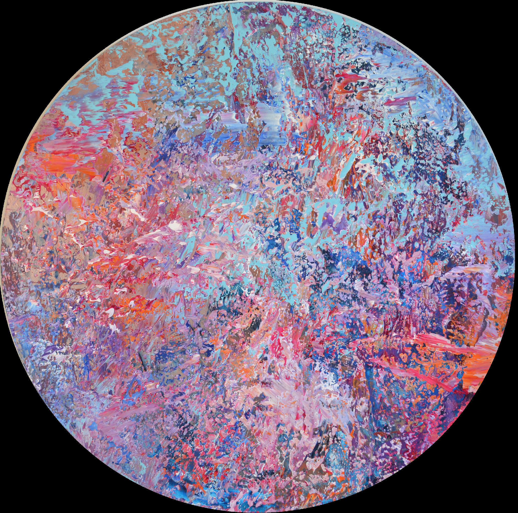 Inspired by the luminous beauty of the Strawberry Moon, this painting evokes the soft, ethereal energy of early summer nights. Built up through many delicate layers, the surface shimmers with metallic rose gold, copper, and iridescent highlights, giving way to a palette of cobalt blue, carmine, magenta, and soft purples. Though rich in texture and depth, the overall appearance remains minimalist and serene — a quiet, celestial atmosphere captured in circular form. The round shape enhances the sense of wholeness and lunar harmony, inviting the viewer into a meditative space of calm and reflection.