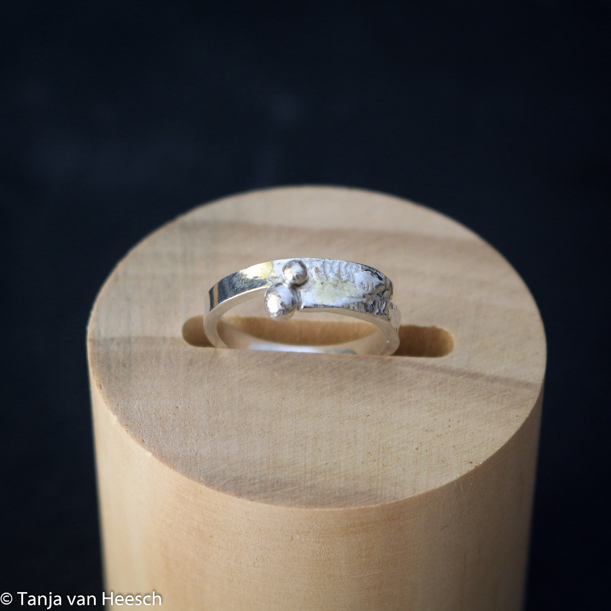 Ring van deels gesmolten zilver met een beetje goud. Ringmaat 18 mm.