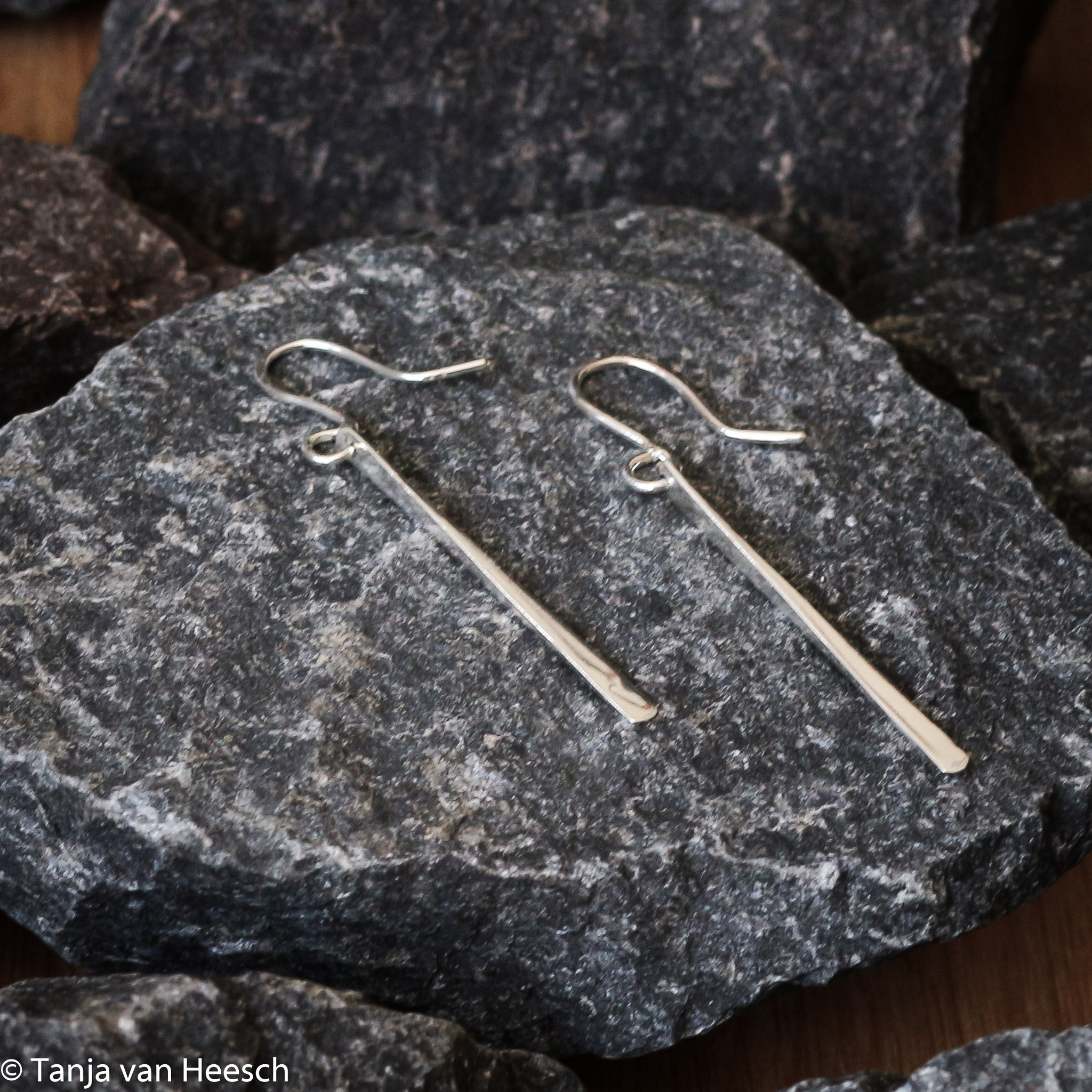 Oorhangers gesmeed zilveren staafje. Staafje is naar de uiteinden plat gesmeed. Staafje is 3,5 cm, incl oorhaken 5 cm.
