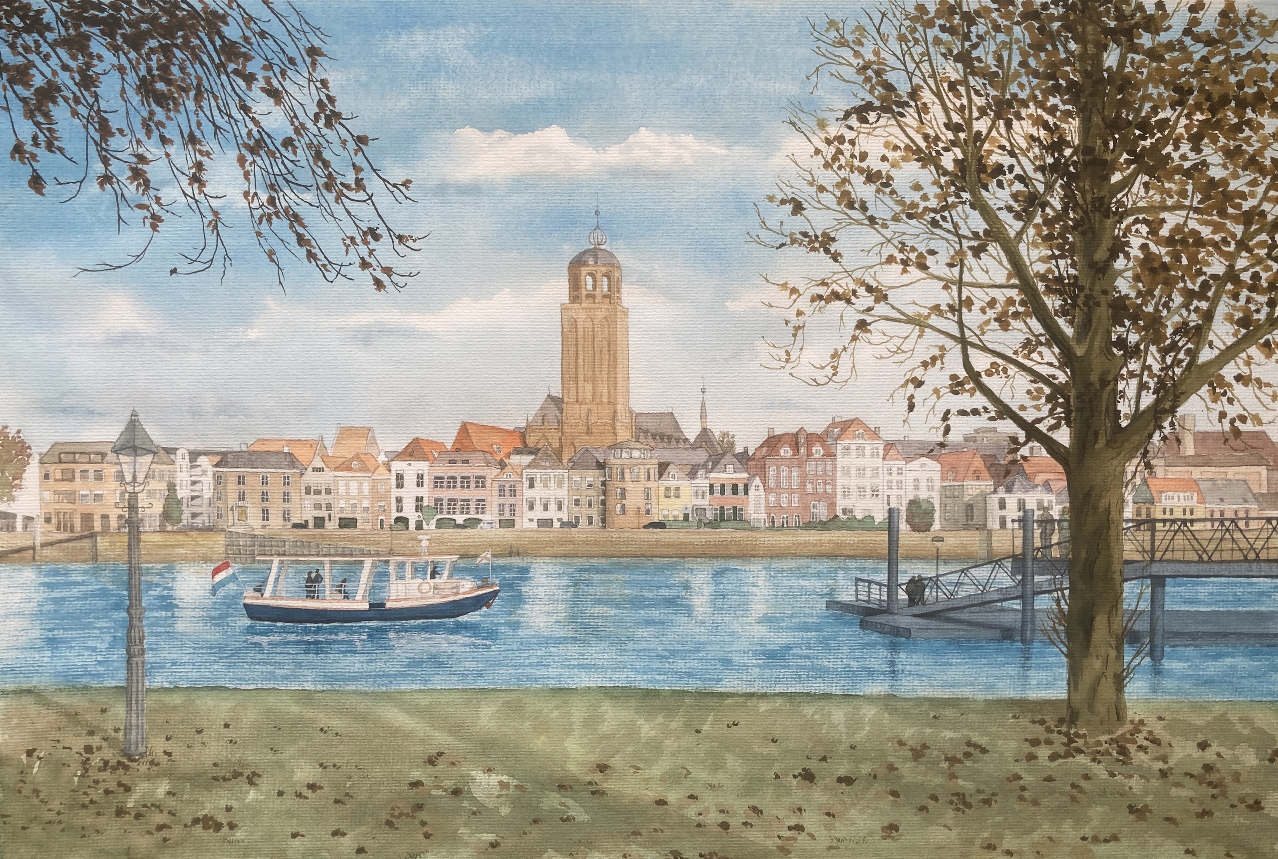 Een kijkje op Deventer vanaf De Worp, met de Lebuïnuskerk en het pontje.
