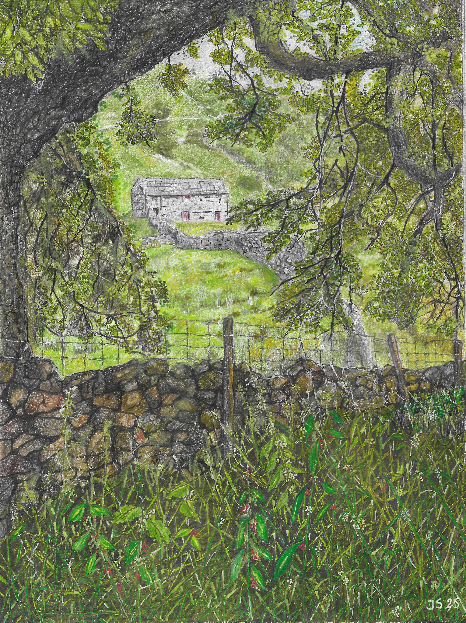 Door de boomtakken kijk je naar een oud huis – een symbool van bestendigheid en verleden, iets dat al lang in het landschap verankerd is. De boom zelf, met zijn zware takken en levendige bladerdek, vormt een levend kader: het heden dat het verleden omarmt. Het gras en de wilde planten op de voorgrond benadrukken dat de natuur alles langzaam terugneemt, maar met zachtheid. Het “doorkijkje” lijkt ook een metafoor voor introspectie: je kijkt niet alleen naar een landschap, maar ook door een venster naar iets innerlijks – een herinnering, een gevoel van thuiskomen, of juist het besef van afstand. Er zit een zekere melancholie in het beeld, maar ook rust: het huis is een stille getuige, de natuur groeit onverstoorbaar verder. Samen vertellen ze een verhaal over tijd, vergankelijkheid en de vrede die ontstaat als alles zijn plek heeft gevonden.