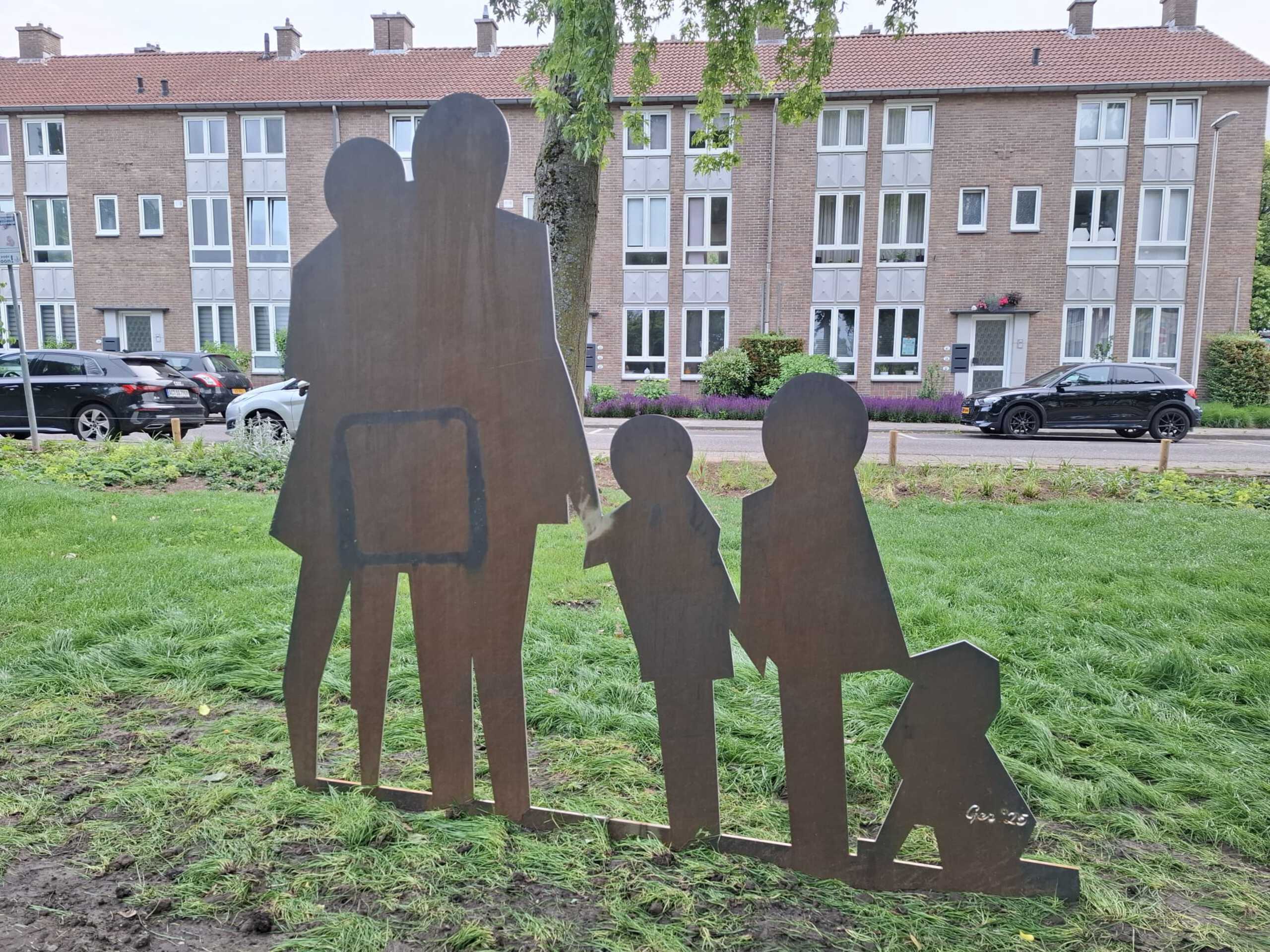 Gezin Eikenderveld. Een beeld van cortenstaal staande in het Charles Hennen platsoen aan de Gebroeders Hennenstraat in Heerlen