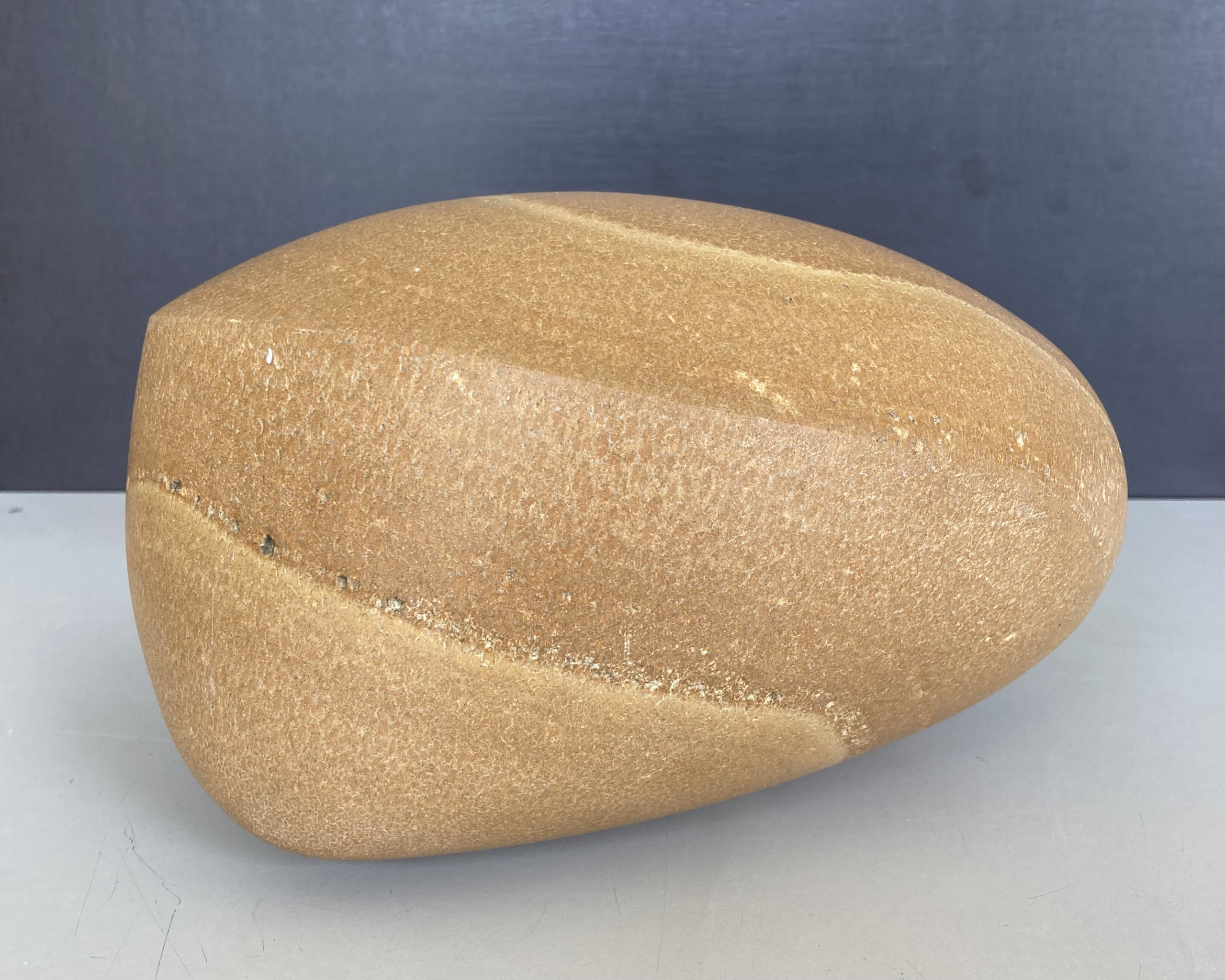 Dit werk is gemaakt van Aragoniet, een steen die wordt gevonden in Iran/Irak. De strakke scheiding tussen voor- en bovenkant gaat achter weg in de ronde vorm. Het werk is rondom zoet geschuurd.