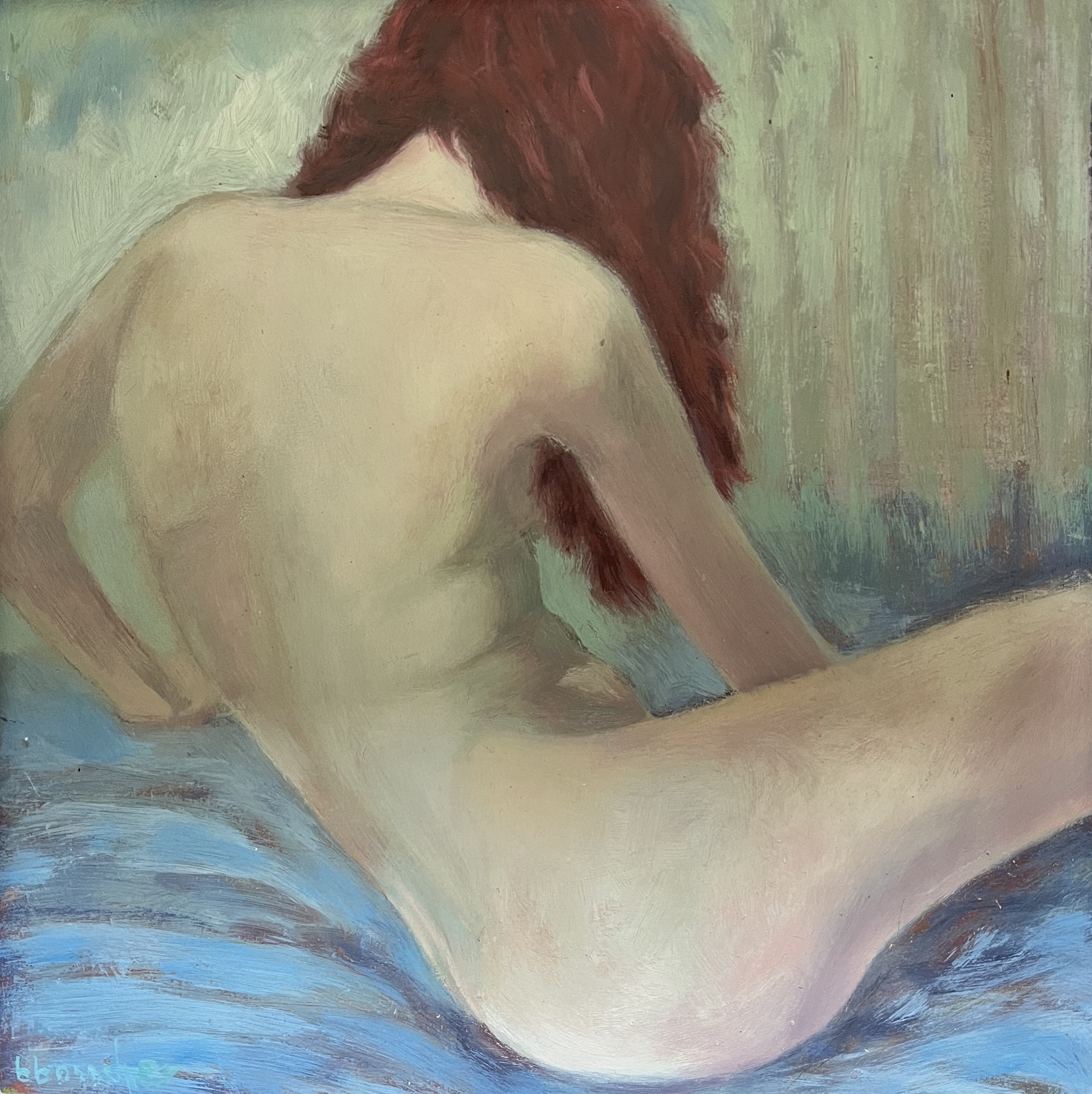 Jonge vrouw met donker rood haar gezeten op blauw kleed. Dit is ingelijst.