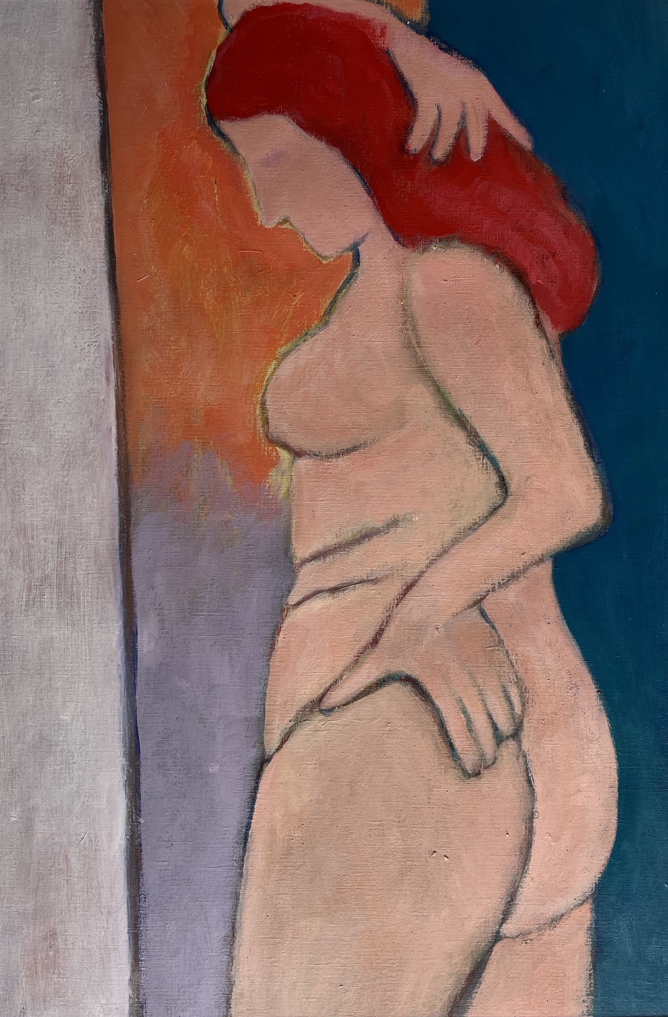 Vrouw staande met rood haar. Het werk zelf is 60-40 cm maar in passepartout van 80-65 cm.