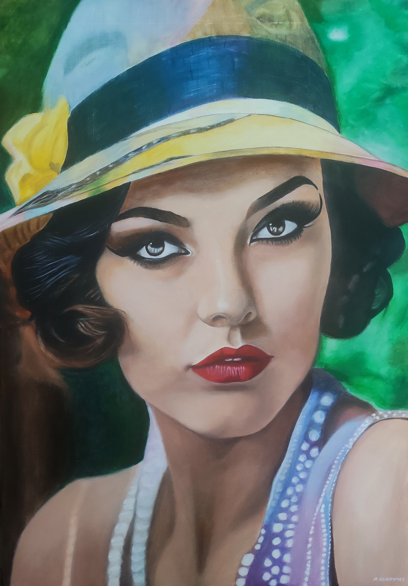 Portret met de charme van de jaren '30 in de vorige eeuw Het gebruik van heldere kleuren, vooral in de hoed en de lippen, en de nadruk op de ogen en gelaatstrekken.