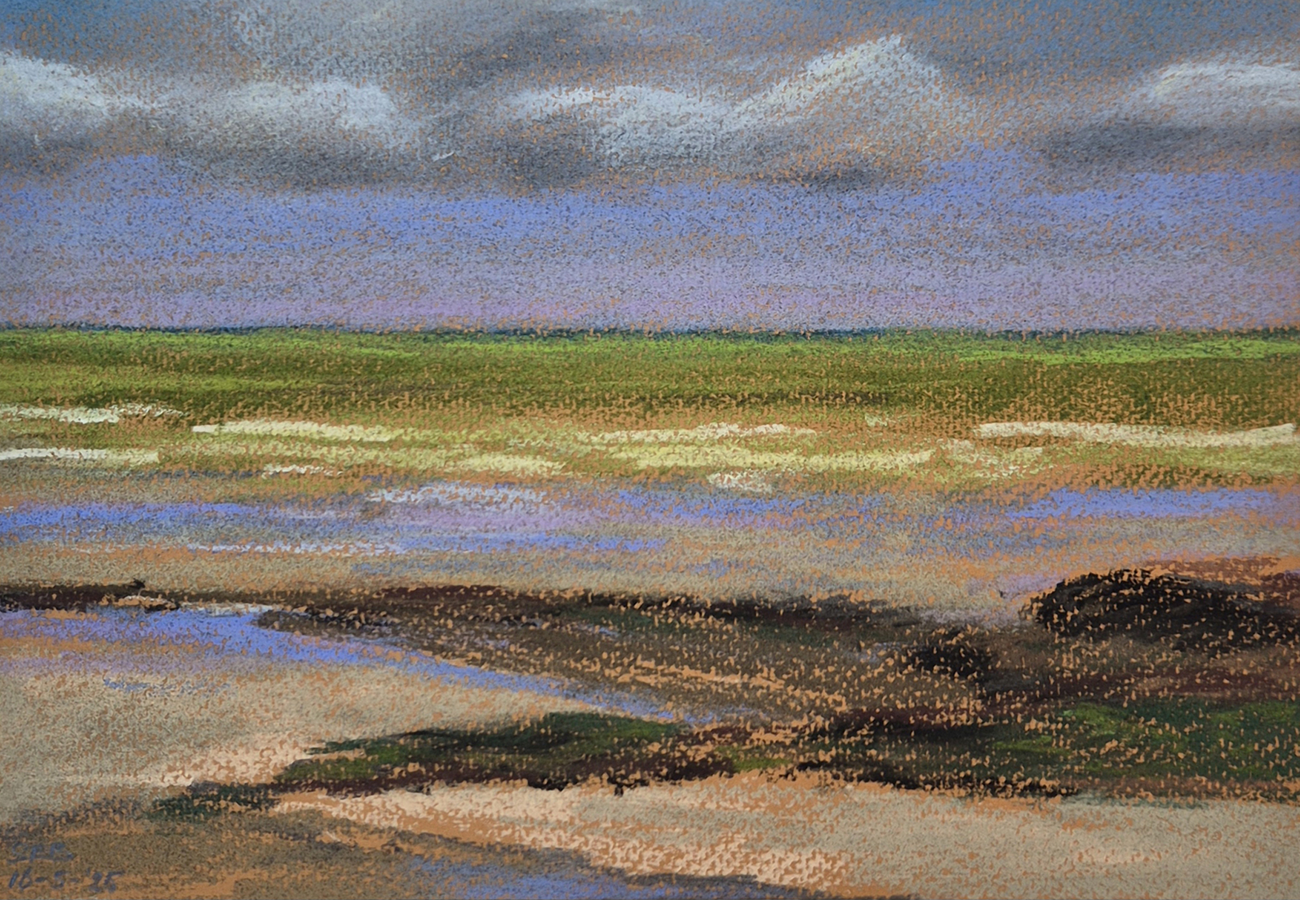 Schilderweek in Normandië. En plein air, softpastel op papier, 17,7 x 25,6 cm. Met passe partout, waarmee de totale afmeting 30 x 40 cm is. In de buurt van Quiberville. 16 mei 2025. In een wissellijst met aluminium rand.