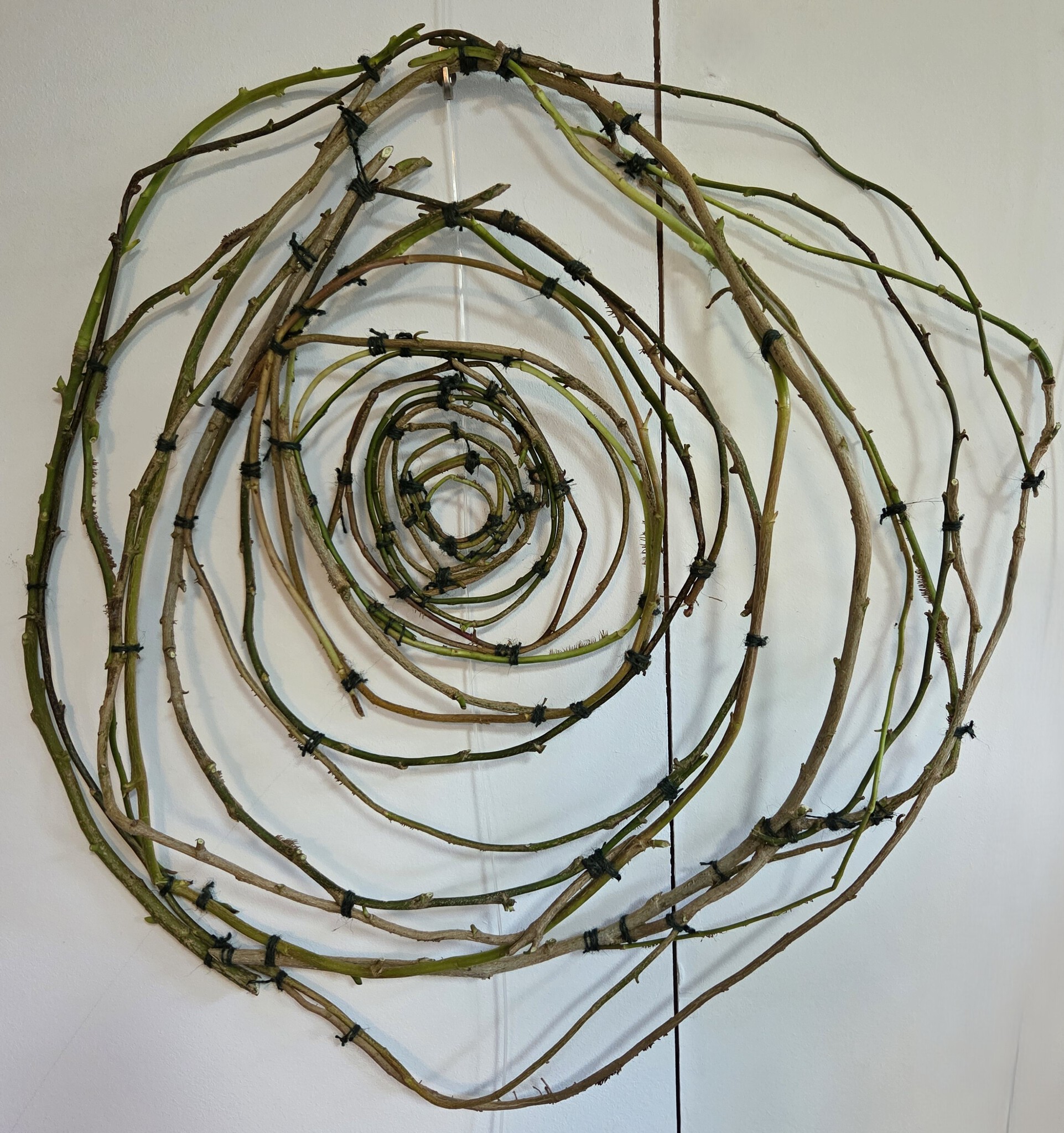 Uit de serie: Cirkels der verbeelding. Nature en haar grilligheid, veerkracht en constante verandering. Tijdens de expositie Oogst van de verbeelding plaatsen 5 kunstenaars op een lange muur cirkels gemaakt met natuurlijke materialen als meanderende luchtbellen. Ik maakte er vier van. geïnspireerd op de tuin, de materialen en de heelheid van harmonie in de natuur en het universum. De cirkel is een universeel erkend symbool dat heelheid, eenheid, eeuwigheid en het oneindige vertegenwoordigt. De perfecte symmetrie wordt gezien als de belichaming van balans en harmonie. Het brengt ook symbolisch cycli en wedergeboorte over vanwege zijn ronde karakter dat geen begin of einde heeft. Vanuit spiritueel perspectief wordt de cirkel gezien als beschermend en heilig – vaak gebruikt in rituelen en ceremonies om heilige ruimtes aan te duiden.