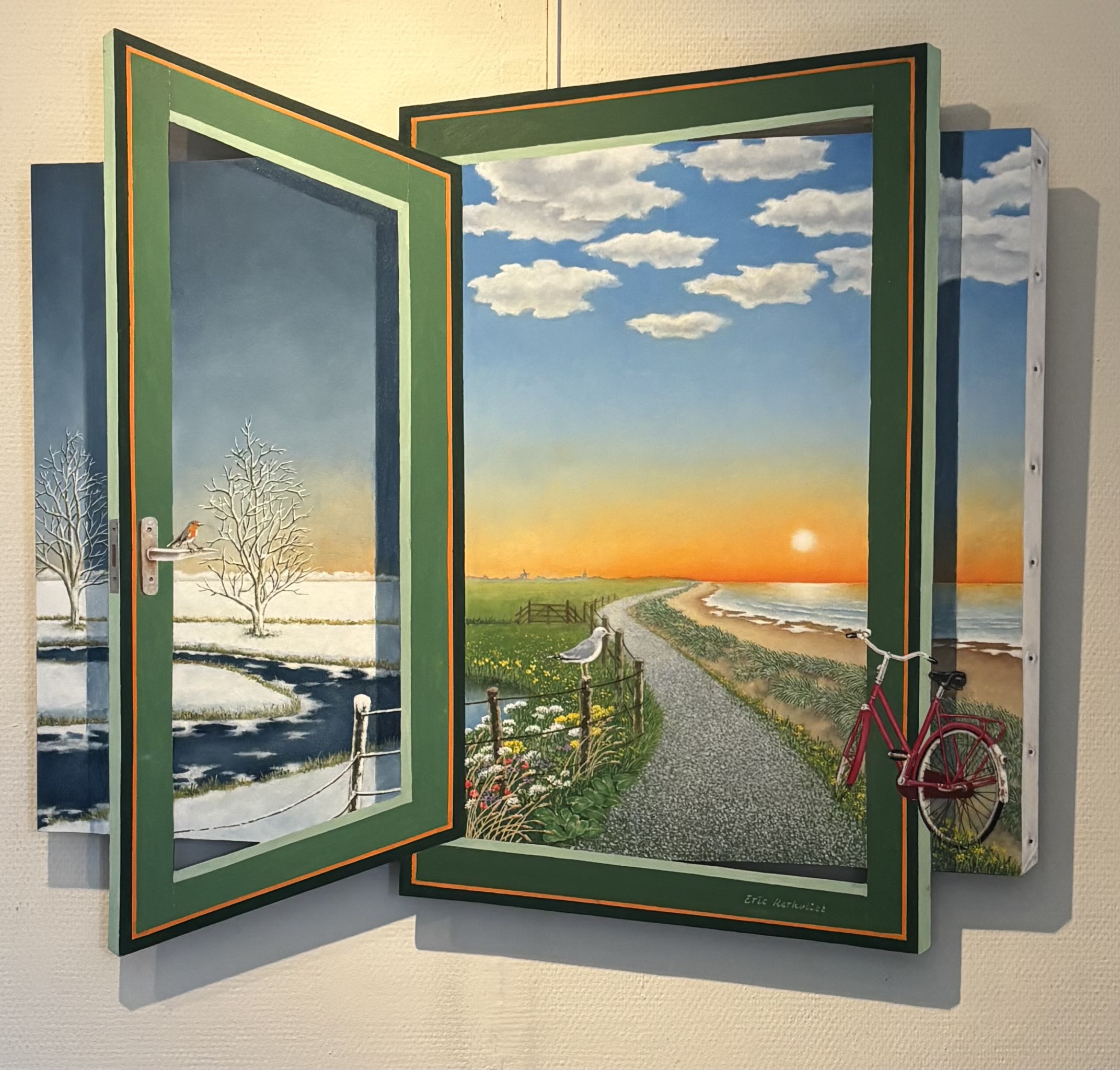 Eric Kerkvliet schildert met olieverf uiterst gedetailleerd voorstellingen op iets verhoogd paneel waardoor bij juiste belichting een Trompe-l’oeil-achtig effect ontstaat.