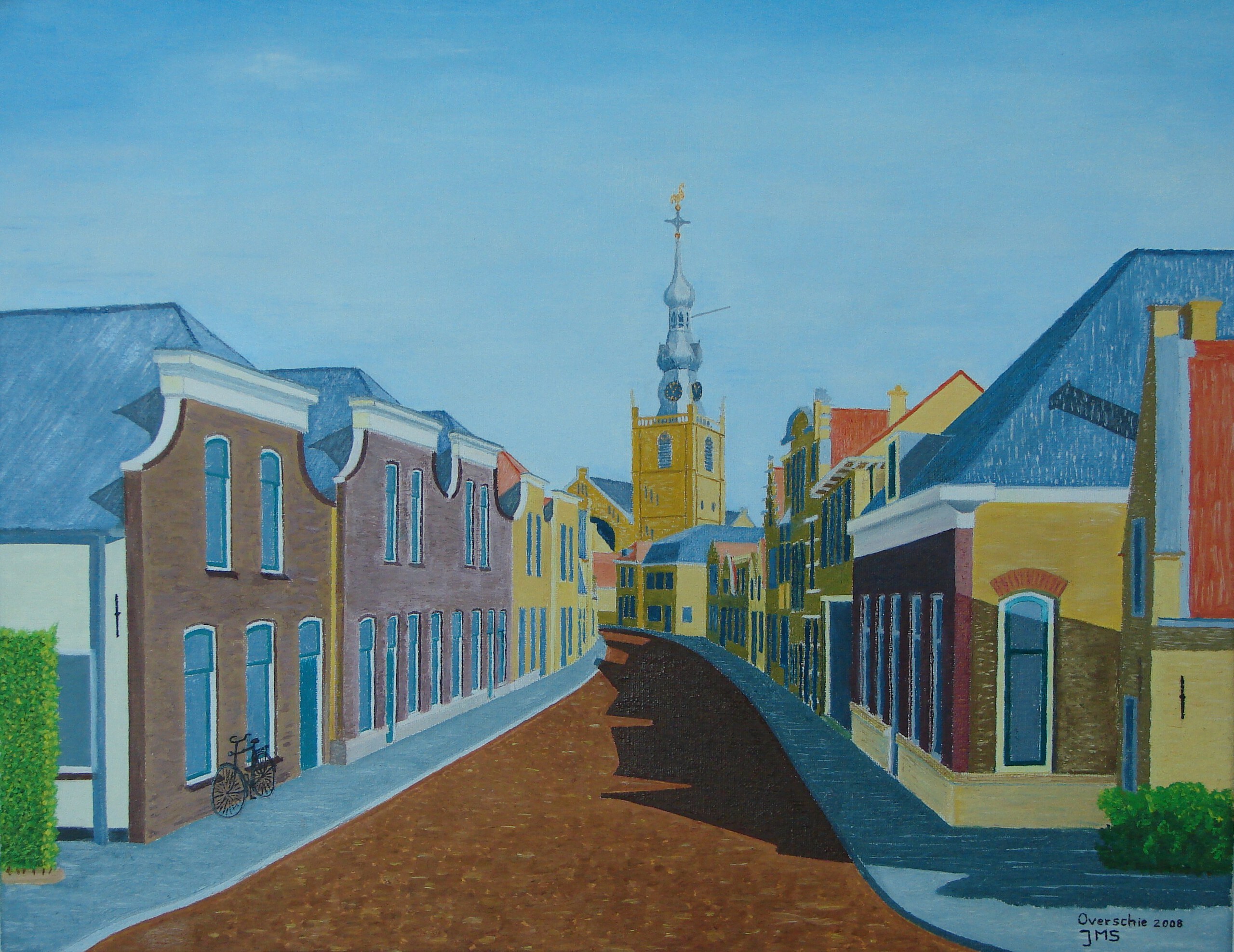 Zicht op Overschiese Dorpsstraat vanaf brug over de Schie