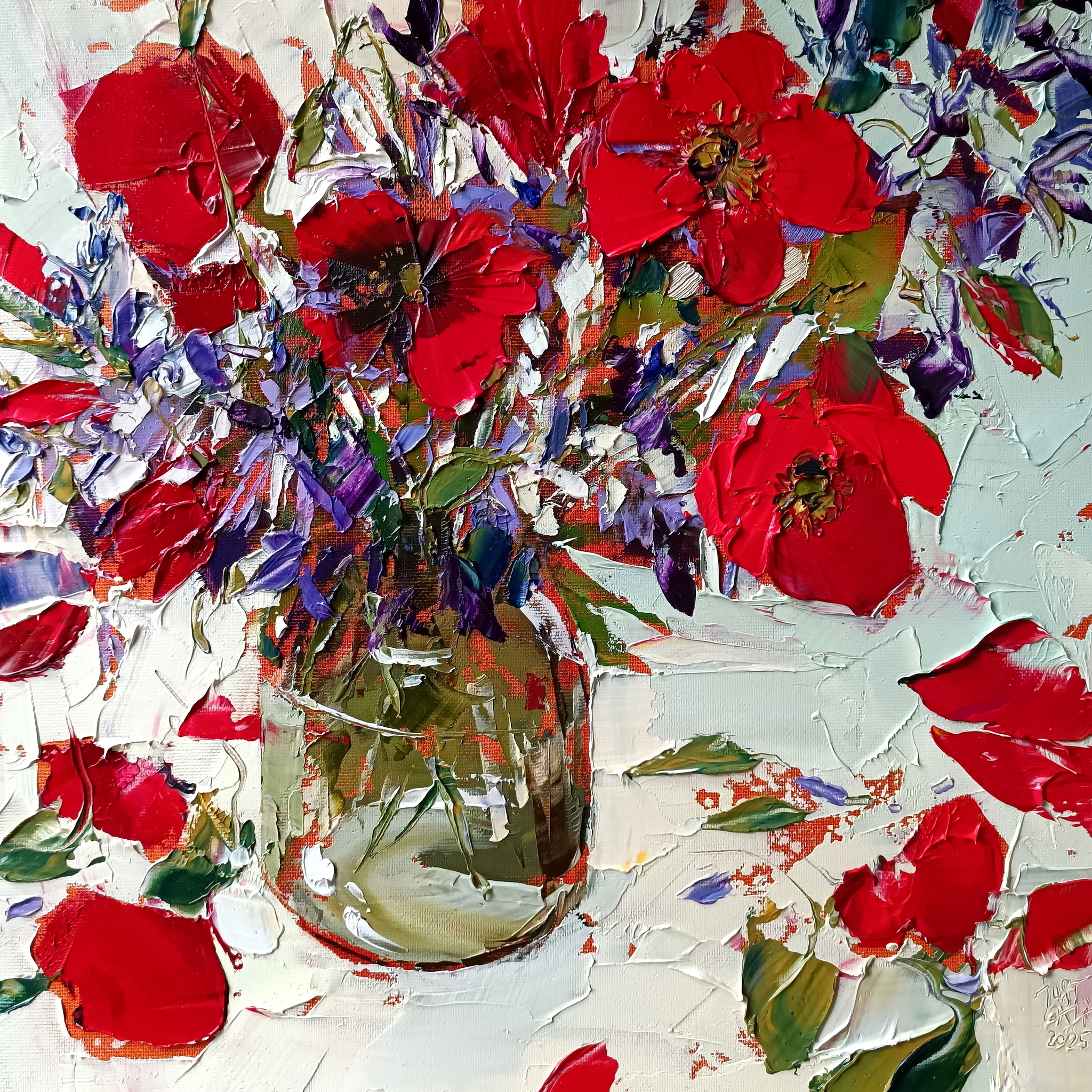 Geschilderd met paletmessen en pasteuze verf (impasto) in alla prima techniek. KLIK OP DE AFBEELDING VOOR EEN CLOSE-UP.