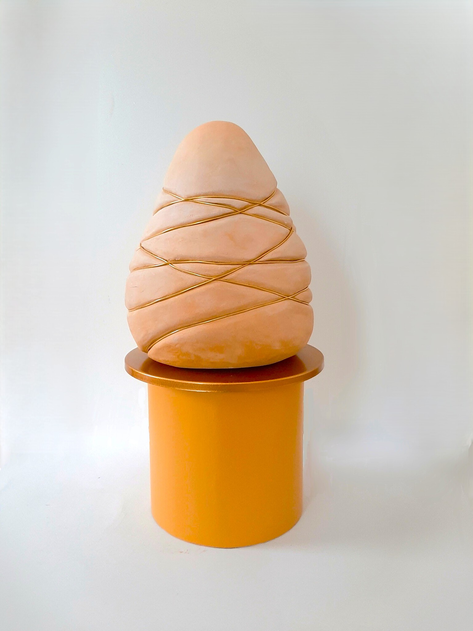 Aardewerk en koper op een houten sokkel met metaal plaat. Eindexamenbeeld, te koop na expo in november
