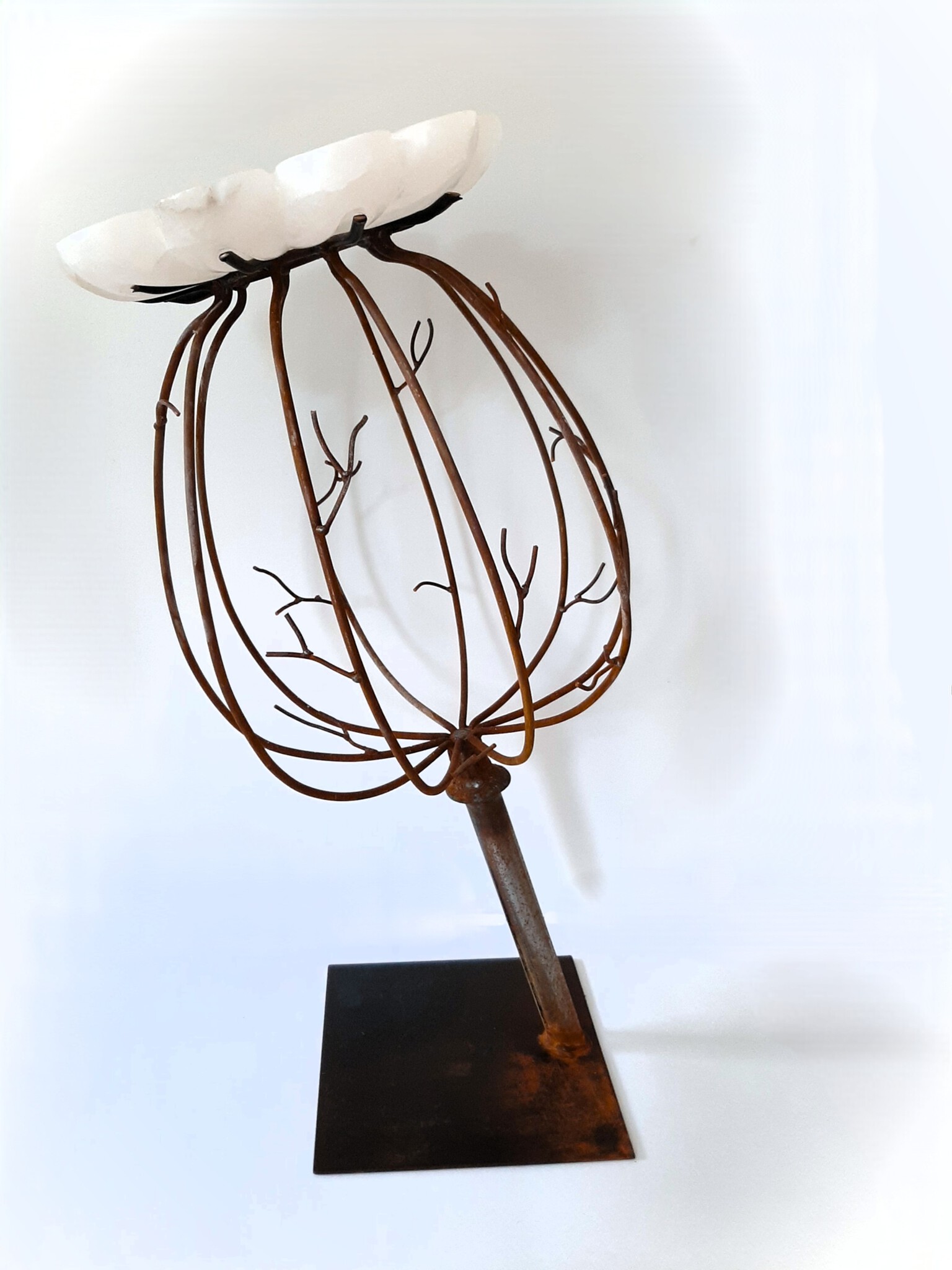 Metaal en wit albast op aansluitend metalen sokkel. Het beeld kan buiten mits goed in de was gezet en de plaat albast bij vrieskou eraf halen. Eindexamenbeeld, te koop na expo in november