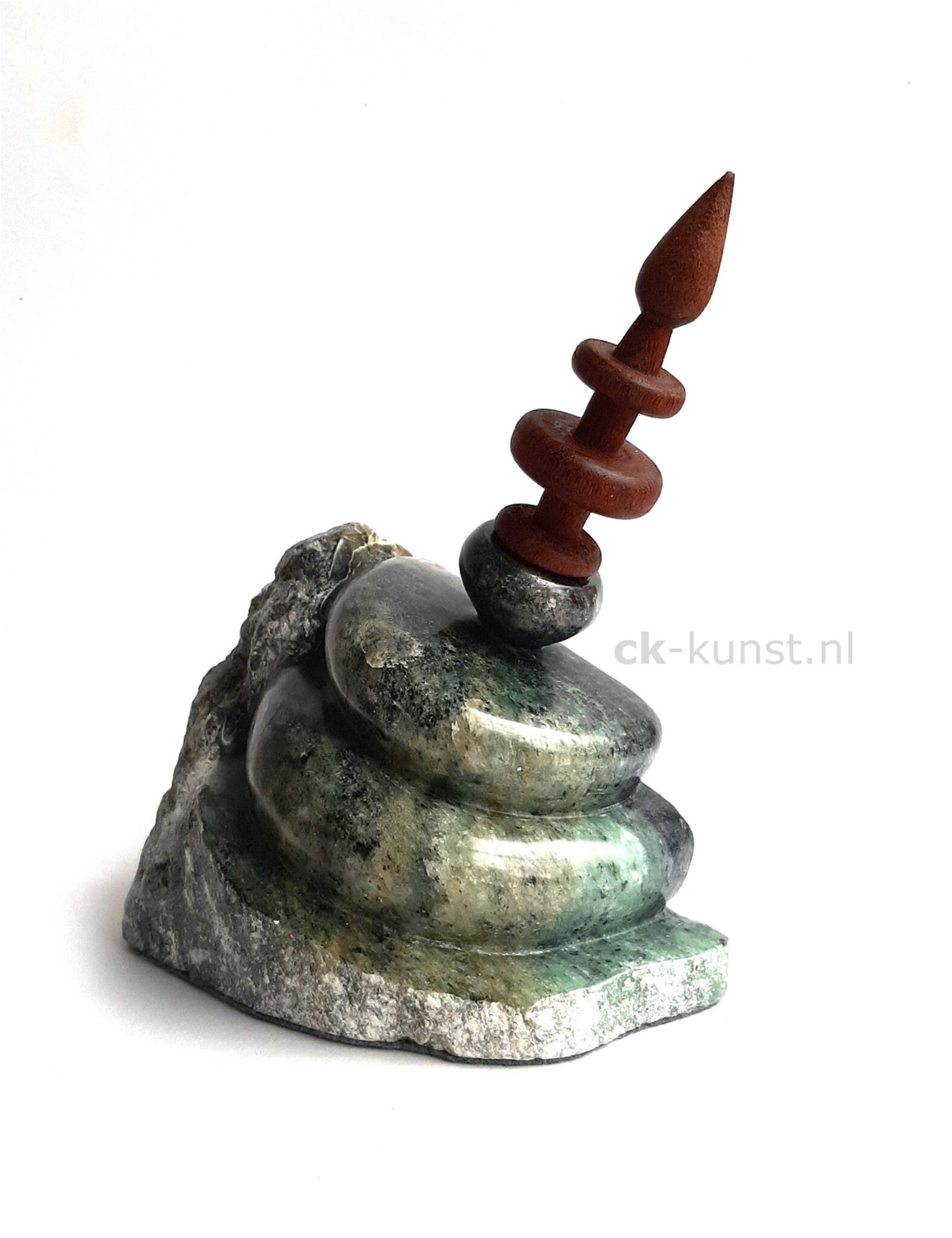 Turquoise Speksteen met houten "kroon" King dingeling is kunst met een knipoog. Intuitief gemaakt, geinspireerd door het hout bovenop. Het verwijst naar blijheid, joepi, ik voel me king dingeling. Tevens een verwijzing naar de deksel van de suikerpot met in het achterhoofd het volgende versje: Naar bed, naar bed, zei Duimelot. Eerst nog wat eten, zei Likkepot Waar zal ik het halen? zei Langejan Uit grootvaders kast, zei Ringeling. Dat zal ik verklappen, zei het Kleine Ding. Tja, wat zal ik zeggen, het brein van de kunstenaar is verder niet uit te leggen.