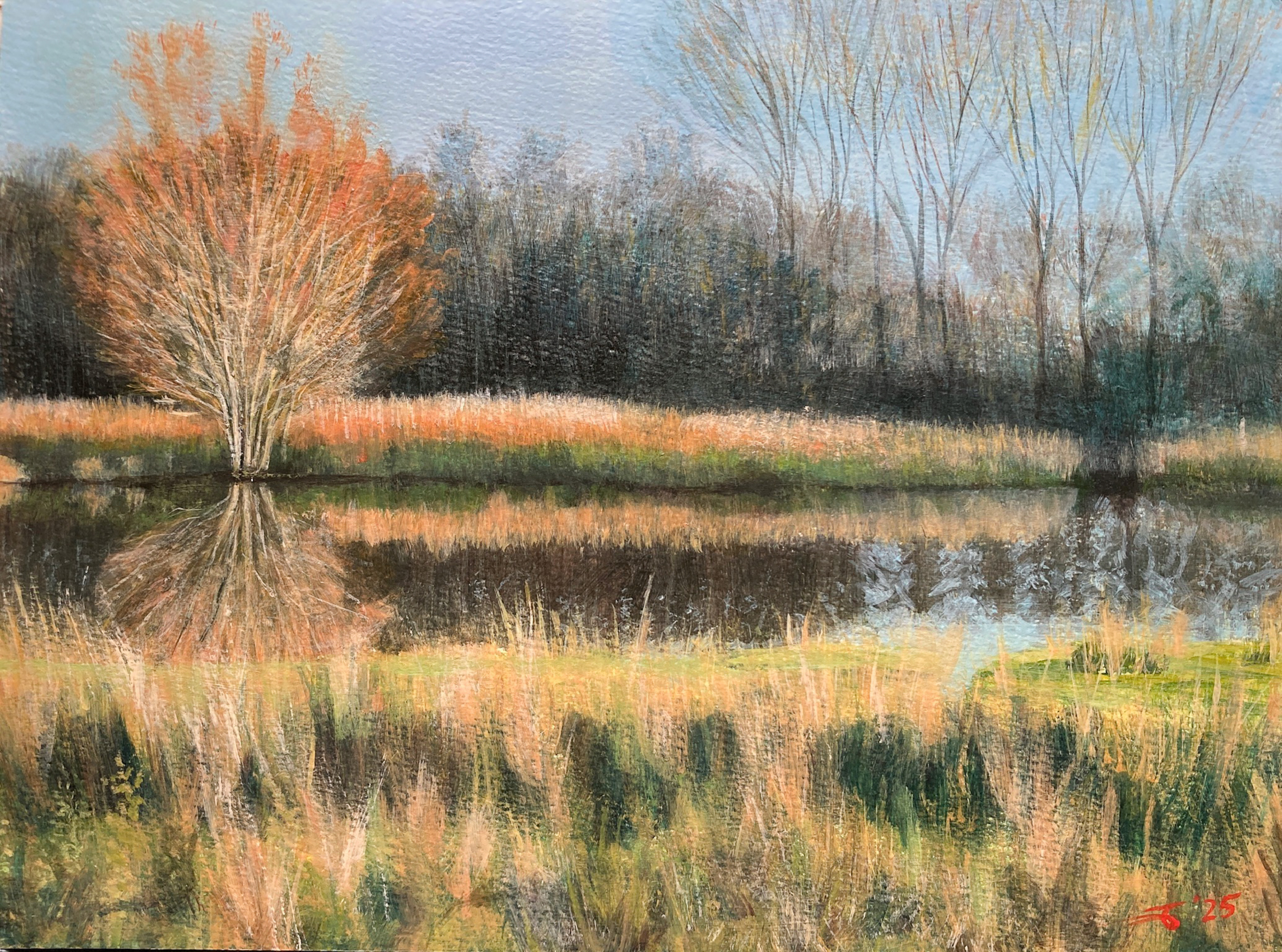 Met 120 hectare drassig natuurgebied vlak naast de Vijverberg in Doetinchem is 'De Zumpe' een inspirerende omgeving voor landschapschilders. Deze meerstammige boom stond bijna te gloeien tegen de achtergrond in de namiddagzon. en werd ook nog eens mooi weerspiegeld in het rimpelloze ondiepe water.