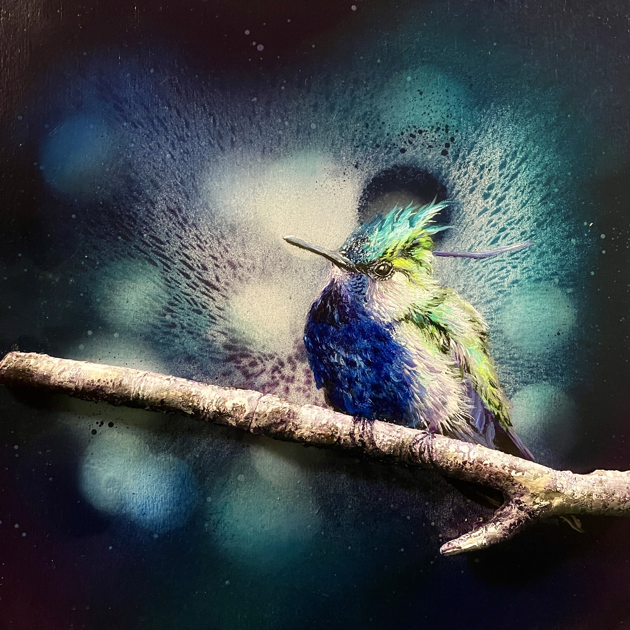 In dit werk probeerde ik de stilte en levendigheid van de natuur vast te leggen. De harmonieuze mix van acryl en spray creëert een abstracte achtergrond, waar de kolibrie in semi-abstract realisme tevoorschijn komt. Het belichaamt veerkracht te midden van de chaos. Met elke penseelstreek stelde ik me voor dat ik een dynamische uitbarsting van leven, een moment van contemplatieve schoonheid in uw ruimte zou brengen, en een gevoel van verwondering en rust zou oproepen.