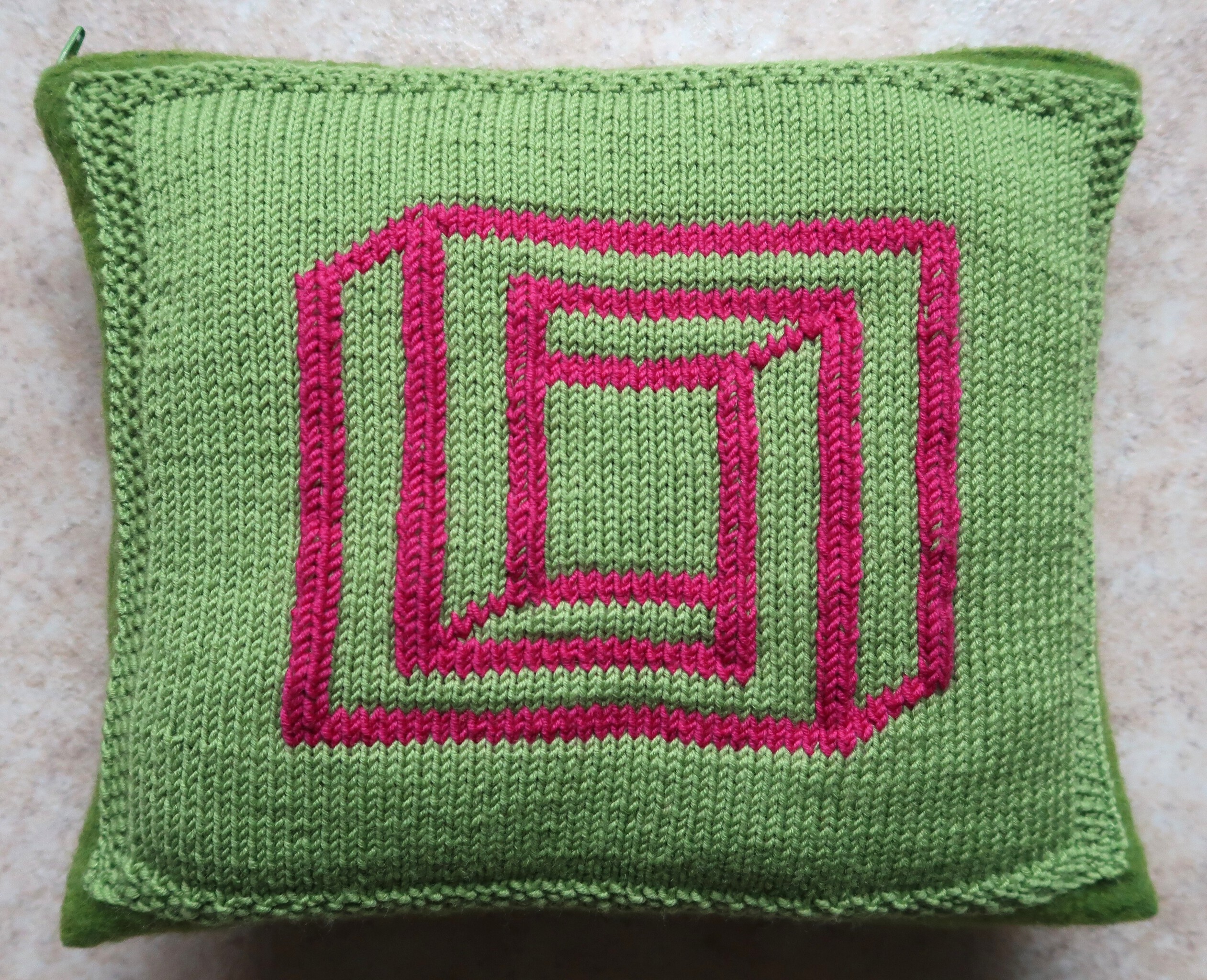 Het breiwerkkussen Open Vierkant - applicatie bevat een optische illusie. Wat het oog waarneemt wordt door de hersenen anders geïnterpreteerd. De ogen blijven constant in beweging door de suggestie een tunnel te zien. De werking van de kleuren versterken deze suggestie.