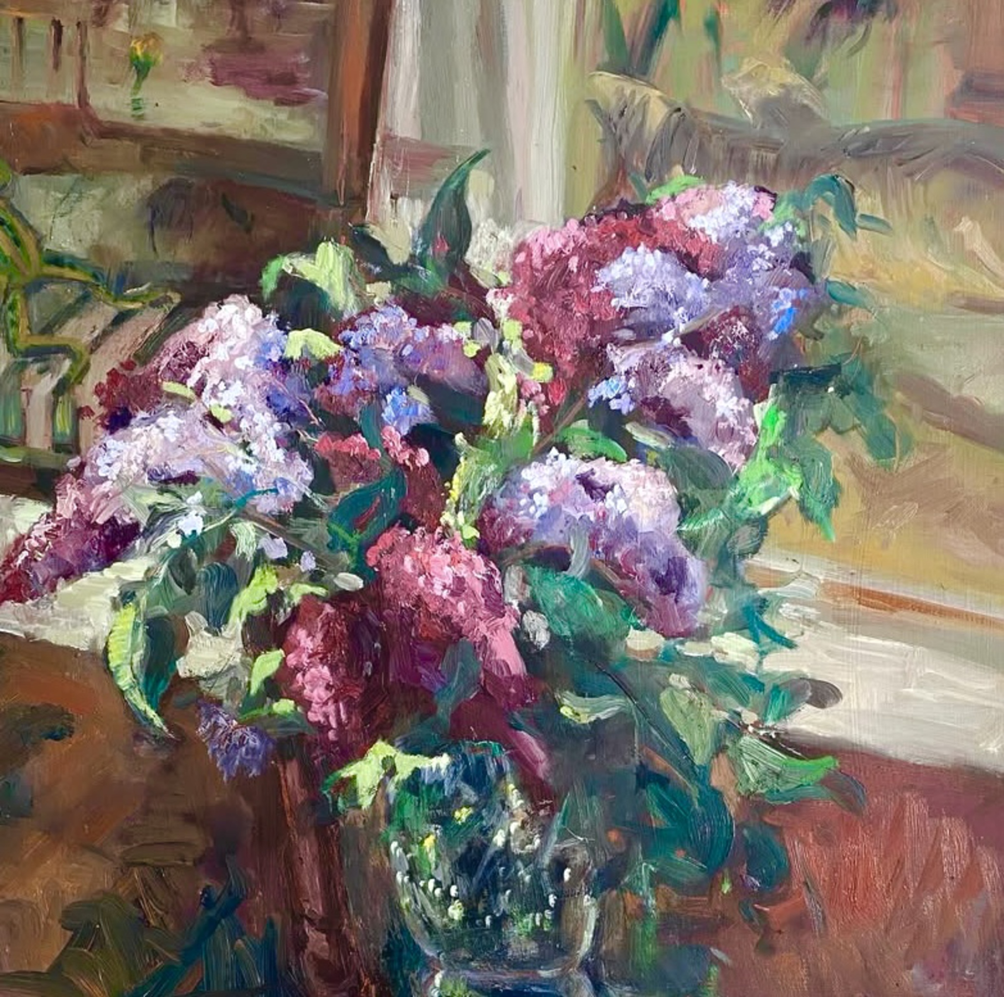 Een stilleven met een bos Seringen en een kikker (2025) Olieverf op doek | 60 x 60 cm