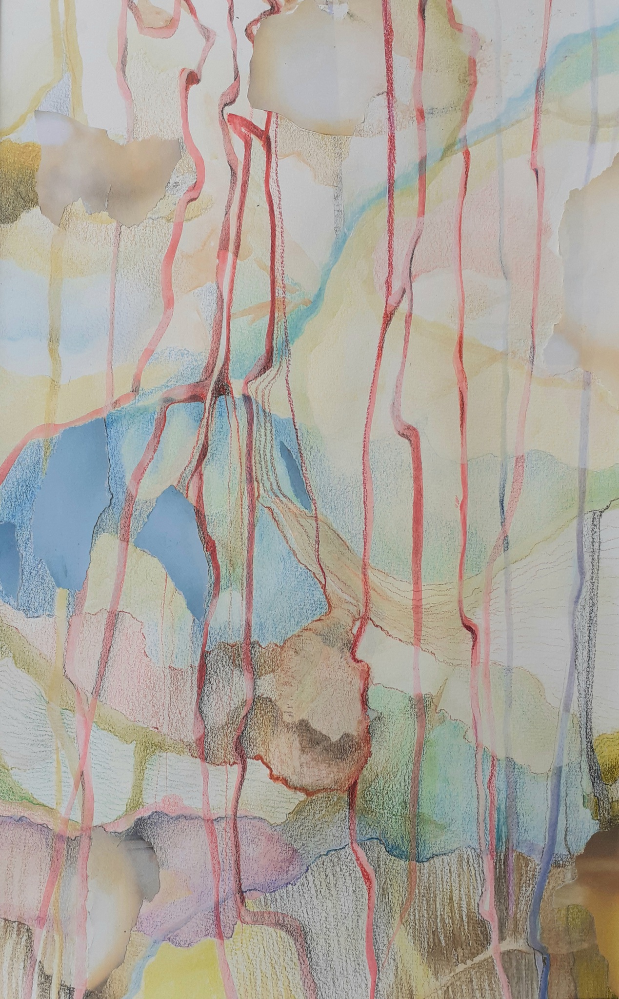 Lijnenspel over ronde vormen met gemengde technieken, : aquarel, collage, kleurpotlood