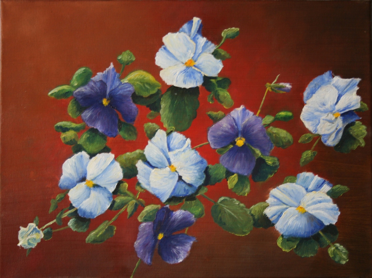 Violen live geschilderd op rode ondergrond.