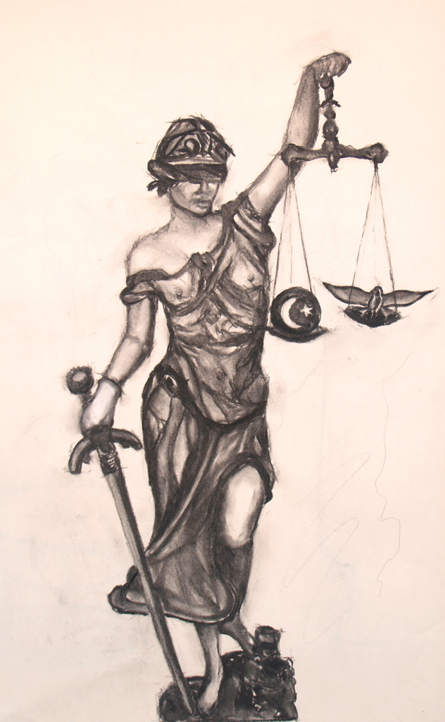 Vrouwe Justitia Illustratie bij een artikel over de PVV (Geert Wilders) in tijdschrift Nový Polygon CZ