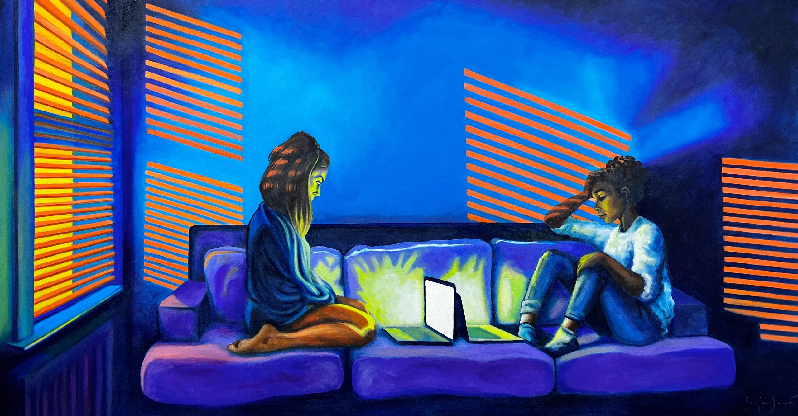Schilderij Blauw Blue Digitaal Kleurrijk Olieverf Effect Blauwe Paletmes Stadsgezicht Interieur Exterieur Uur Hour Glitch