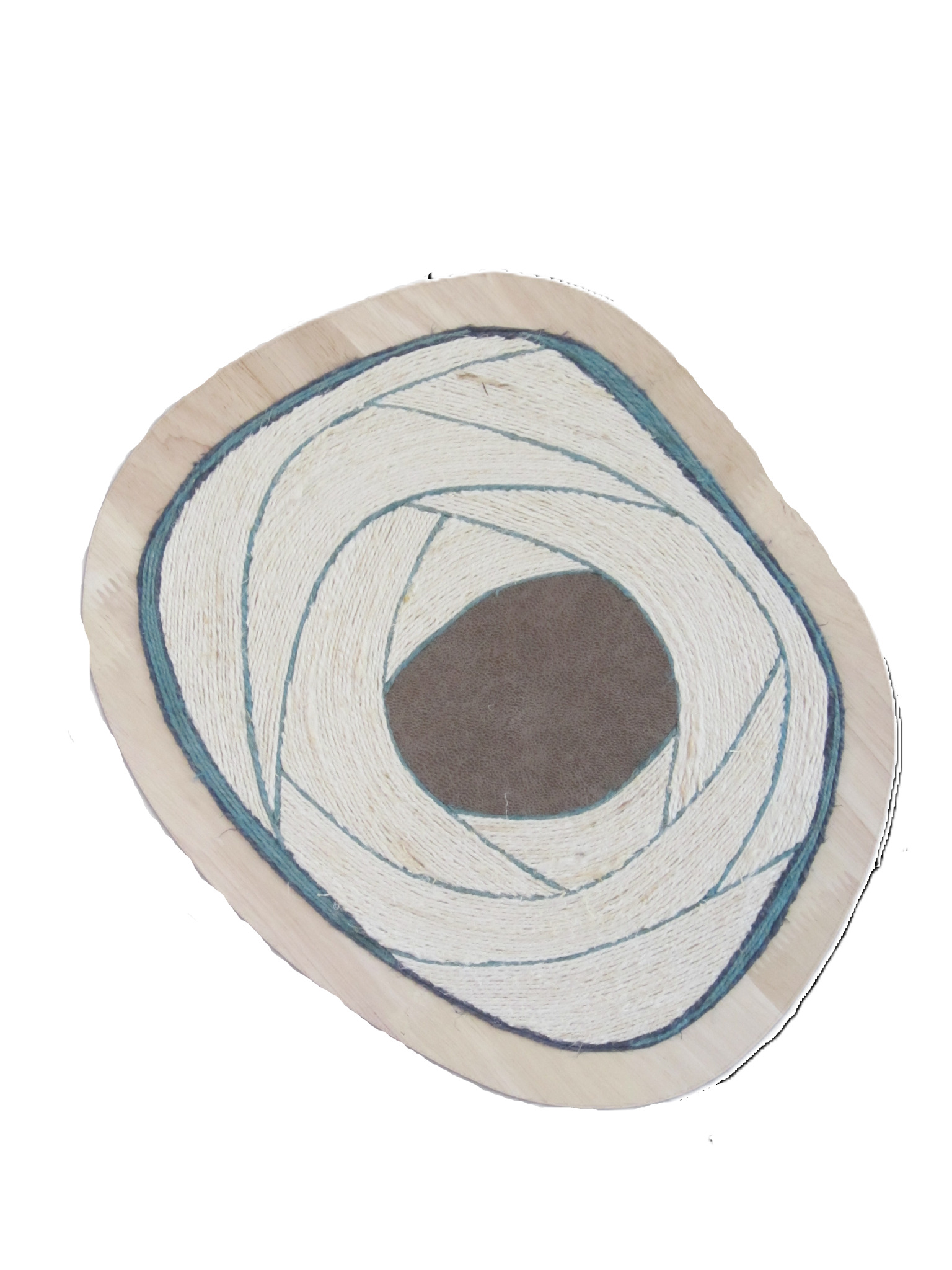 Kunstwerk van vlastouw op een organisch paneel van hout. Naast vlas is er gebruik gemaakt van leer in de kleur greige.