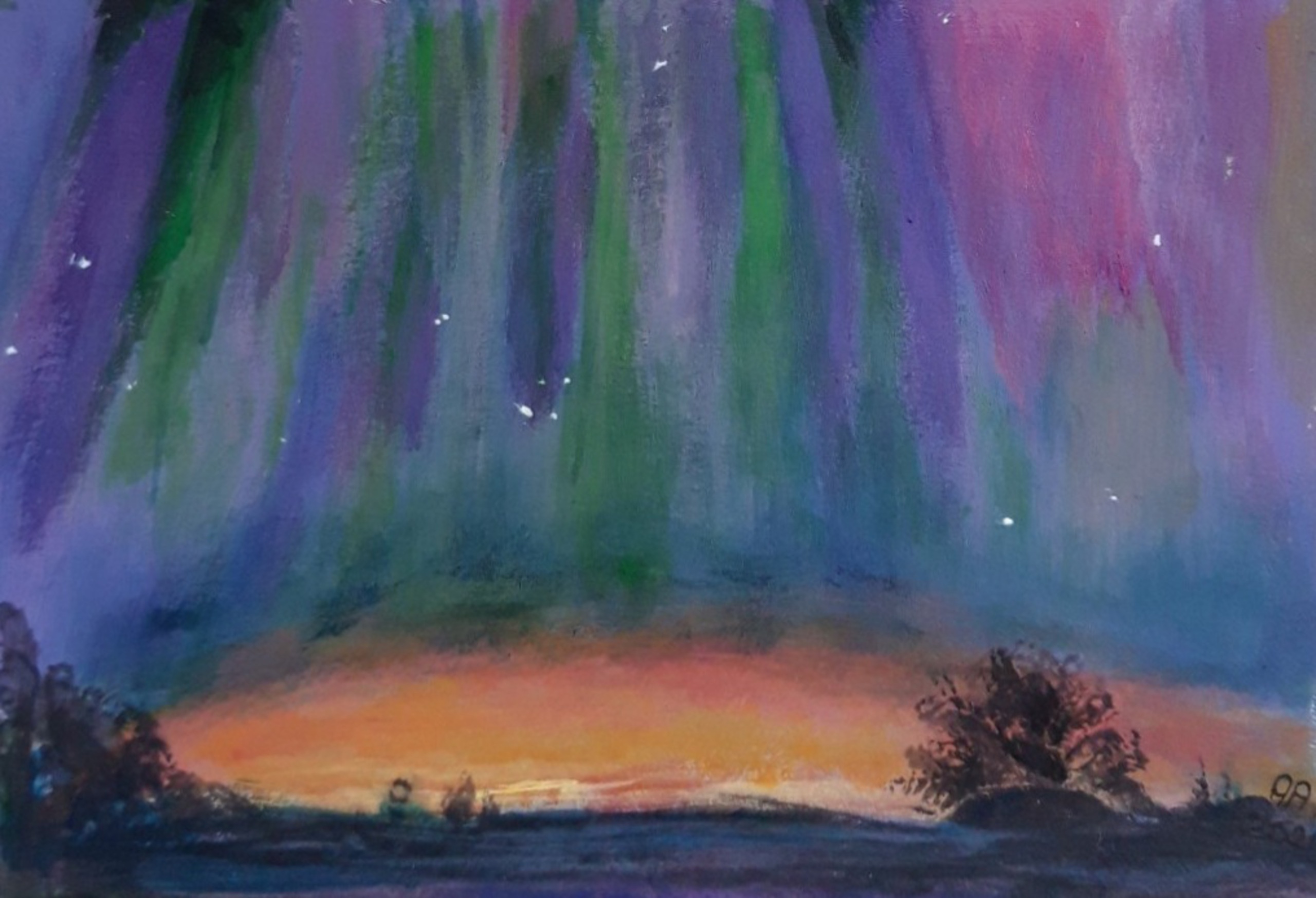 Kleine schildering Noorderlicht stralen op karton met kunststof zwarte lijst