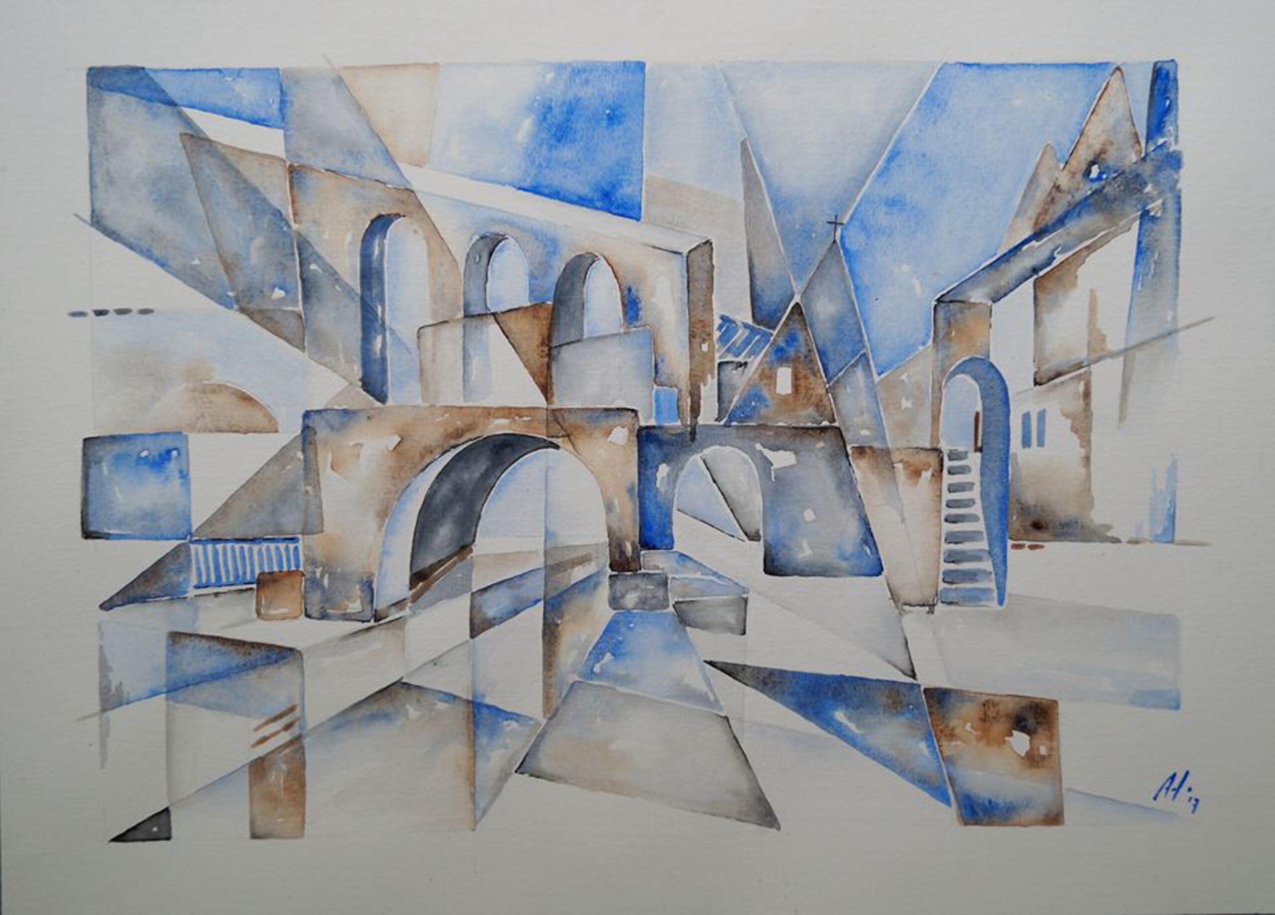 Abstract Aquarel Architectuur Stadsgezicht Geometrisch Waterverf Kubisme Annecy
