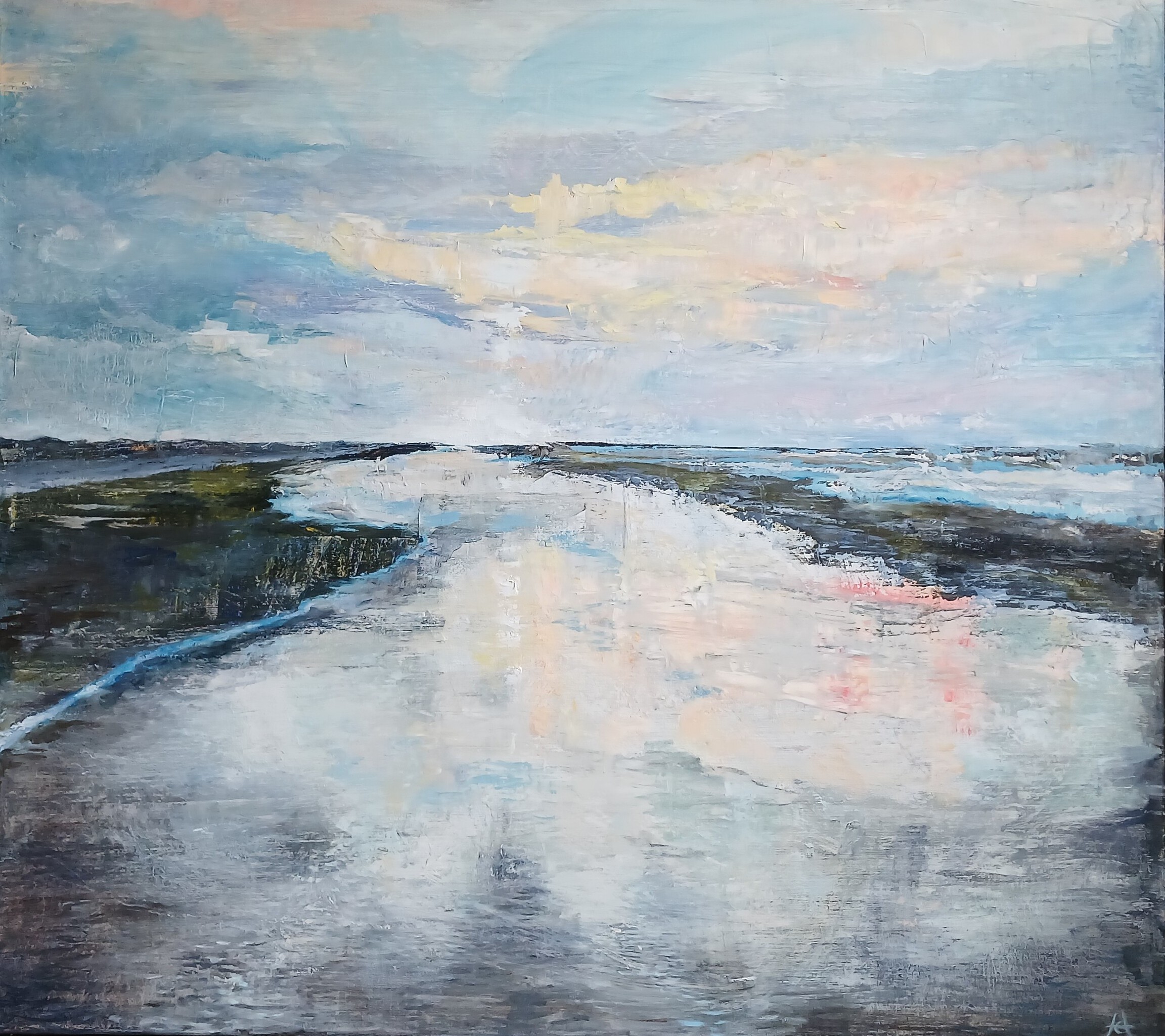 Wanneer het eb wordt en er een strook water op het strand overblijft..