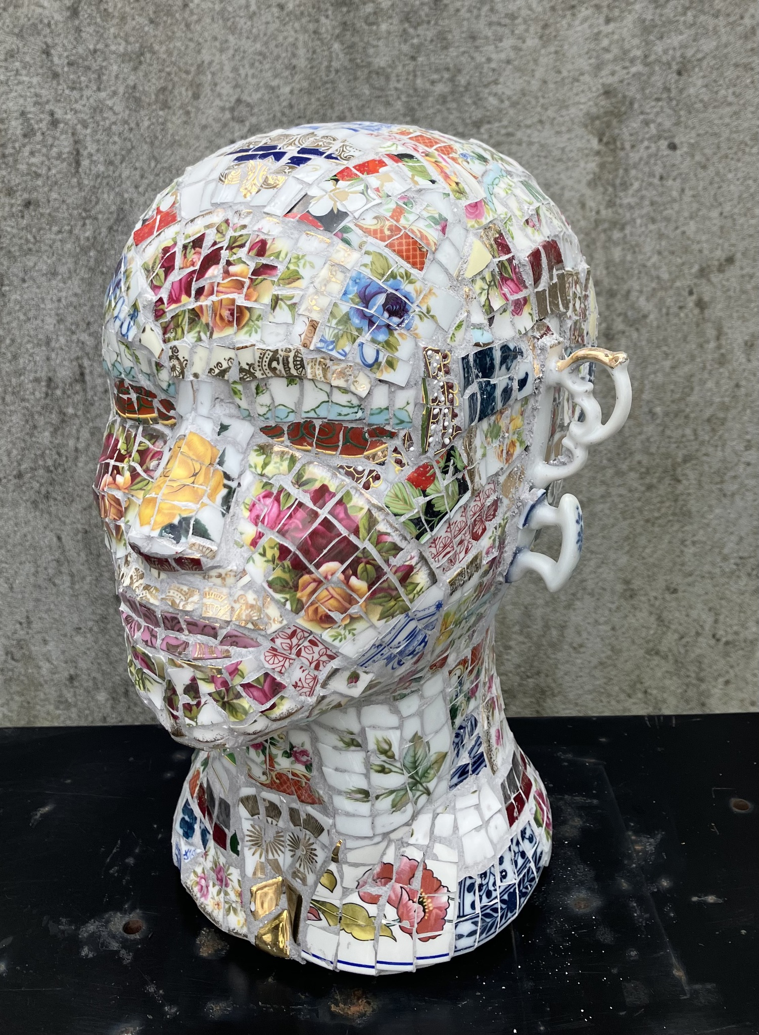 Menshoofd belegd met oud servies.