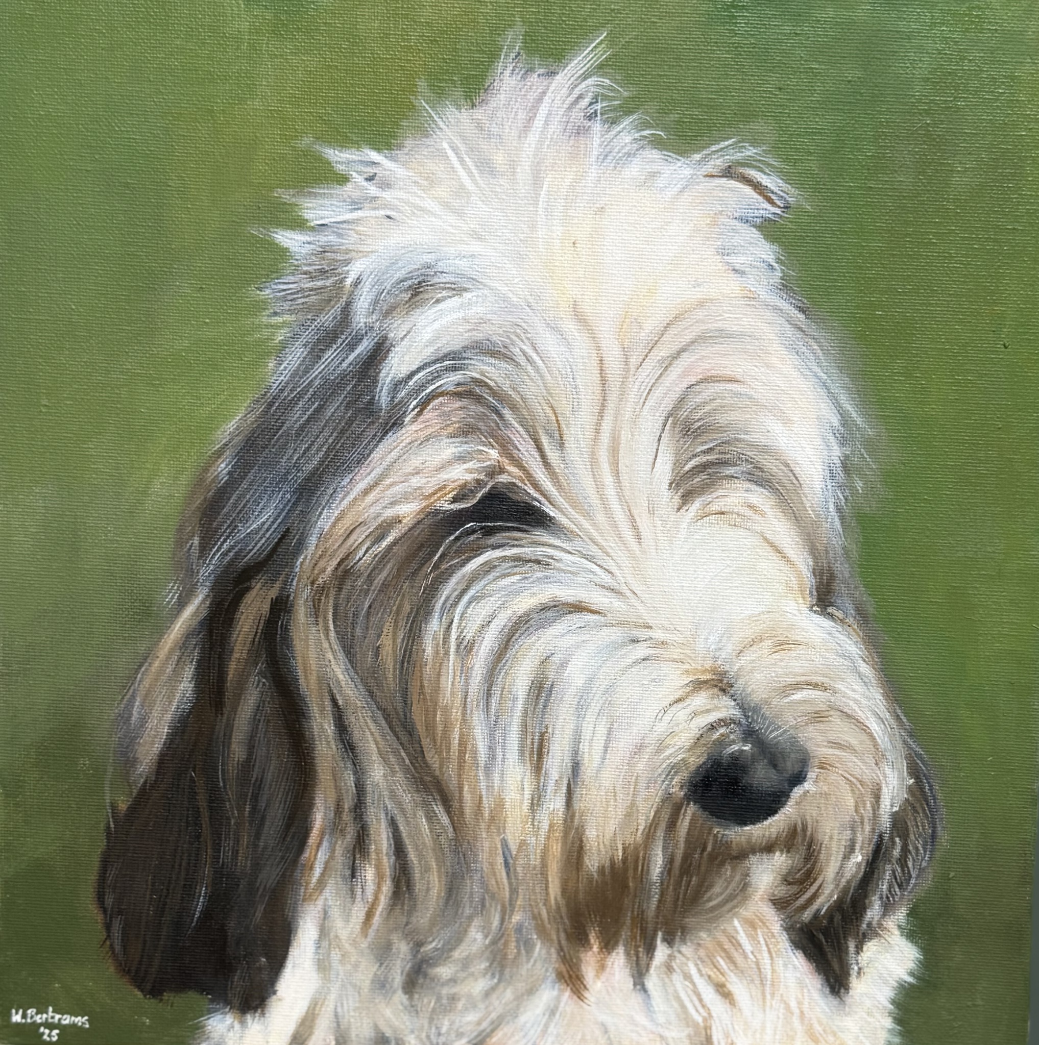 Ik heb dit schilderij voor Marco & Marie gemaakt omdat zij hun hond Partout sinds 13 maart 2025 kwijt zijn. Partout (overal) struinde graag rond in de bosrijke omgeving van hun camping in La Soupèse. Op 13 maart keerde hij niet terug en de trekker die hij altijd om had was uitgezet. Een lange en emotionele zoektocht volgde. Tot op de dag van vandaag is Partout onvindbaar. De hoop en overtuiging dat hij terugkeert neemt steeds meer af. Ik hoop dat met dit schilderij hij toch een beetje bij hen is.
