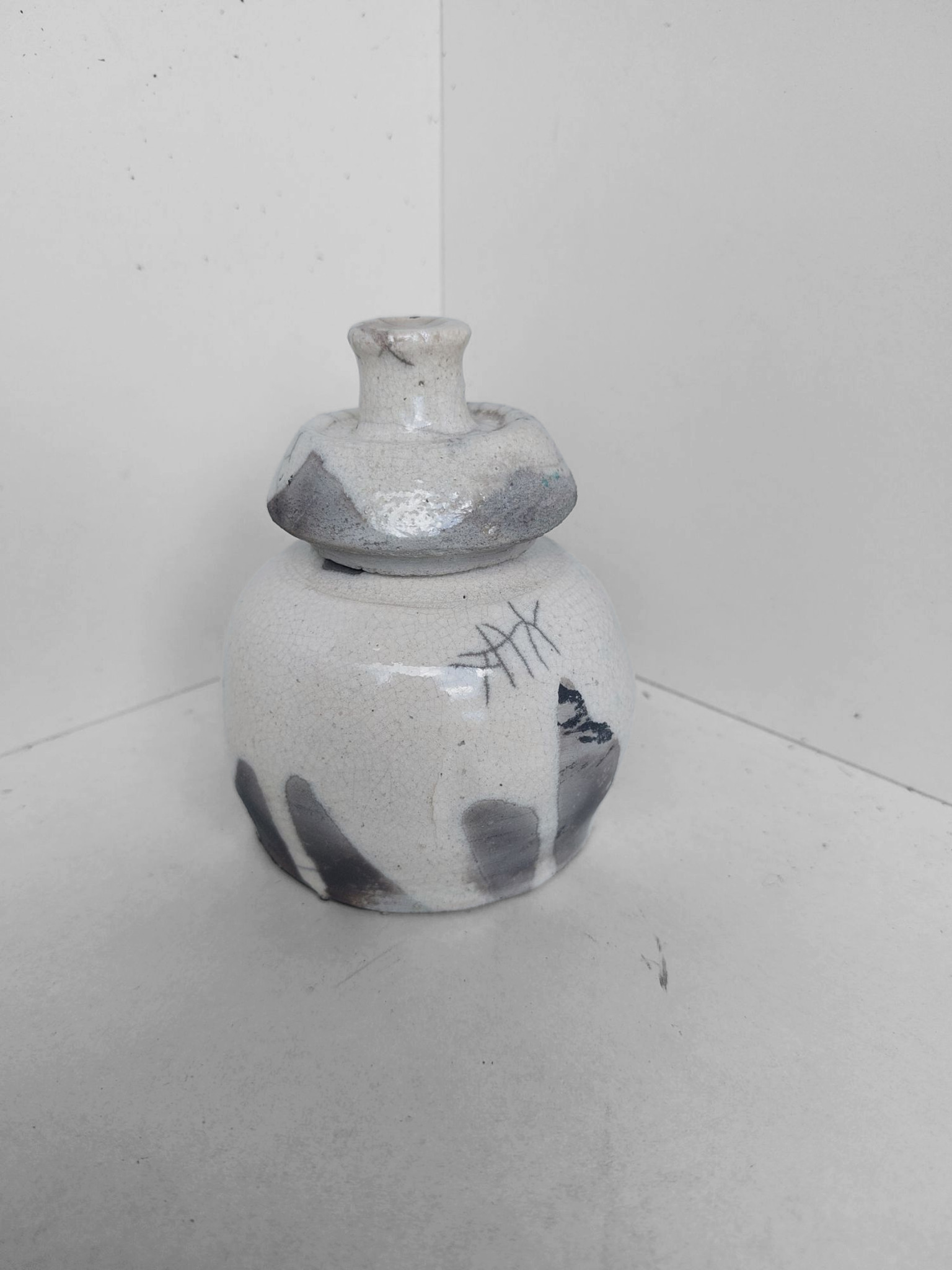 Klein wit raku gestookt potje met zwarte stukken en craquelé. Deze is gedraaid op de draaischijf en kan als urntje dienen.