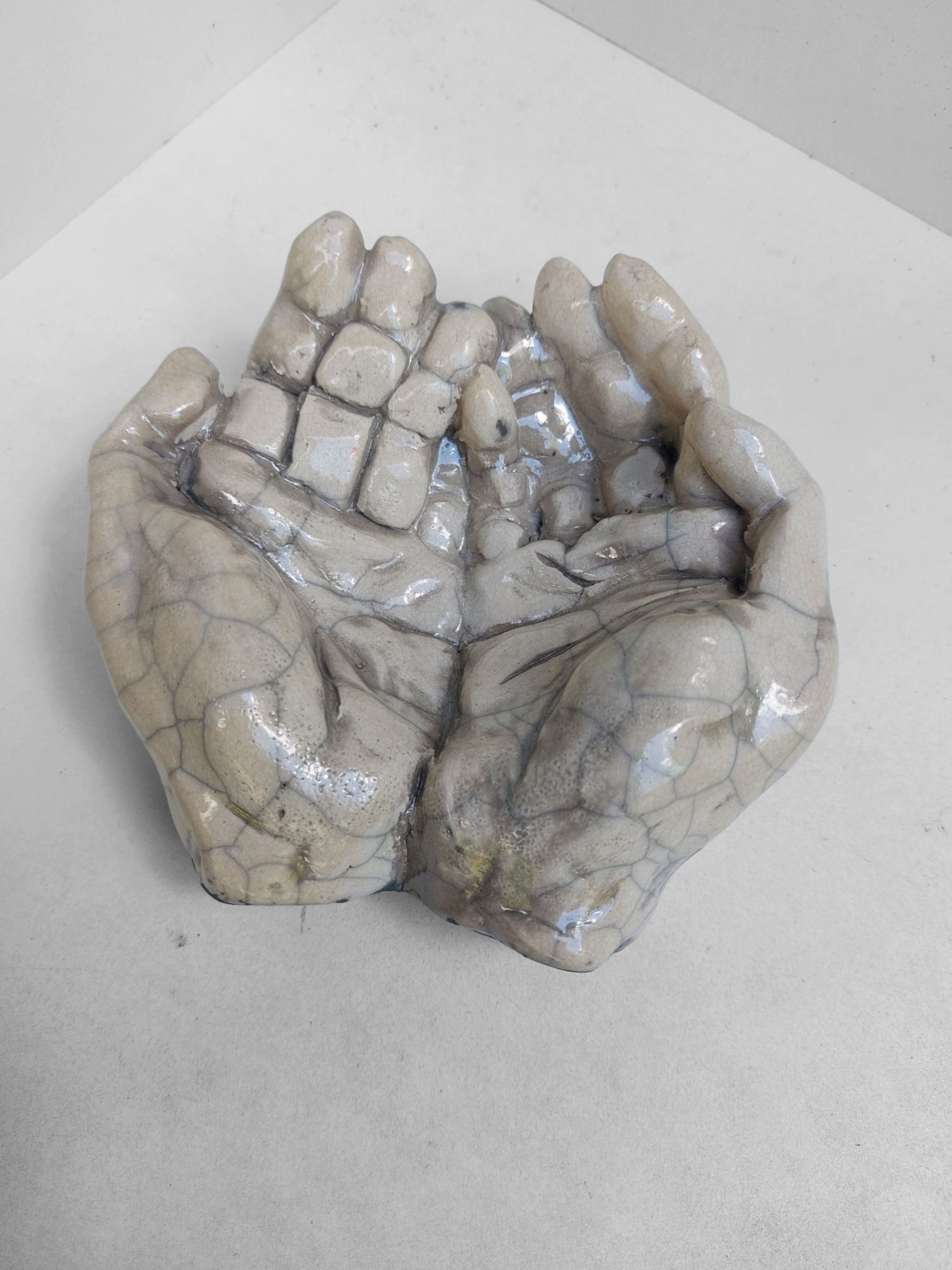 Kommetje van twee handen, in wit met zwart raku gestookt.
