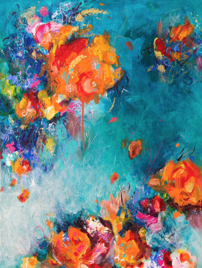 Dit intuïtief geschilderde kleurrijke werk is - zoals elk van mijn intuïtieve schilderijen - weer een enorme verrassing voor mijzelf als maker. Wat begon met een overwegend geel tafereel, licht, zacht, werd gaandeweg een beeld dat mysterie ademt. Een blik op een verborgen wereld, verscholen achter vurige wilde bloemen en vlammend goud. Een spel van licht en donker, warm en koud, energie en stilte. En binnen mijn schilderijencollectie ontstaat telkens weer een nieuw kleurenpalet, terwijl het handschrift inmiddels duidelijk herkenbaar en persoonlijk is. Samen roept het steeds weer een energieke, dynamische sfeer en emotie op. En zorgt voor een plek in huis waar je even kunt ontsnappen aan het dagelijks bestaan. Wat doet dit werk met jou? Neem bij interesse in dit werk contact op via mail of het contactformulier op de site.