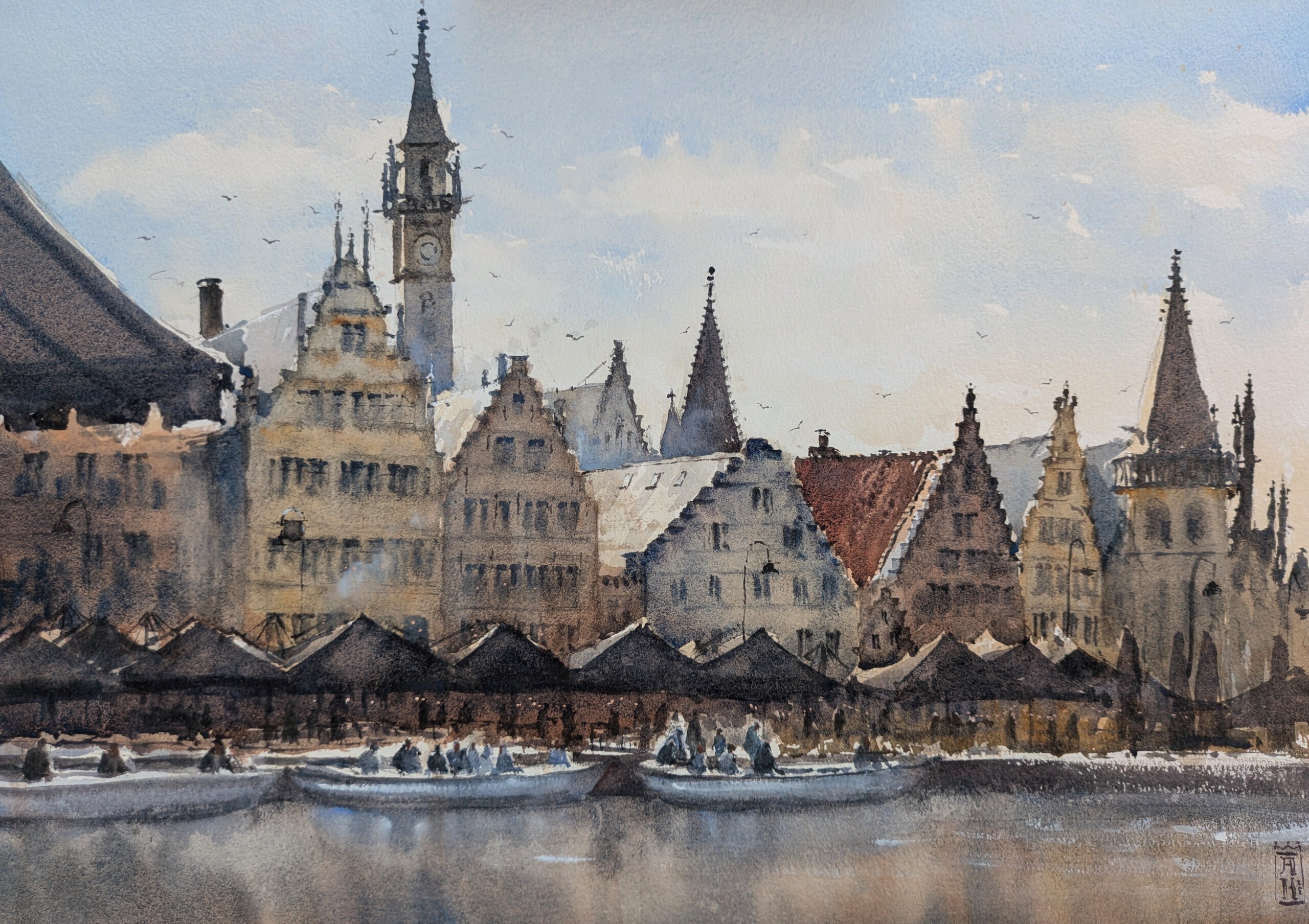 Gent Belgie Graslei Aquarel Realistisch Bootjes Terrassen Schilderij Belgium Ghent Watercolor