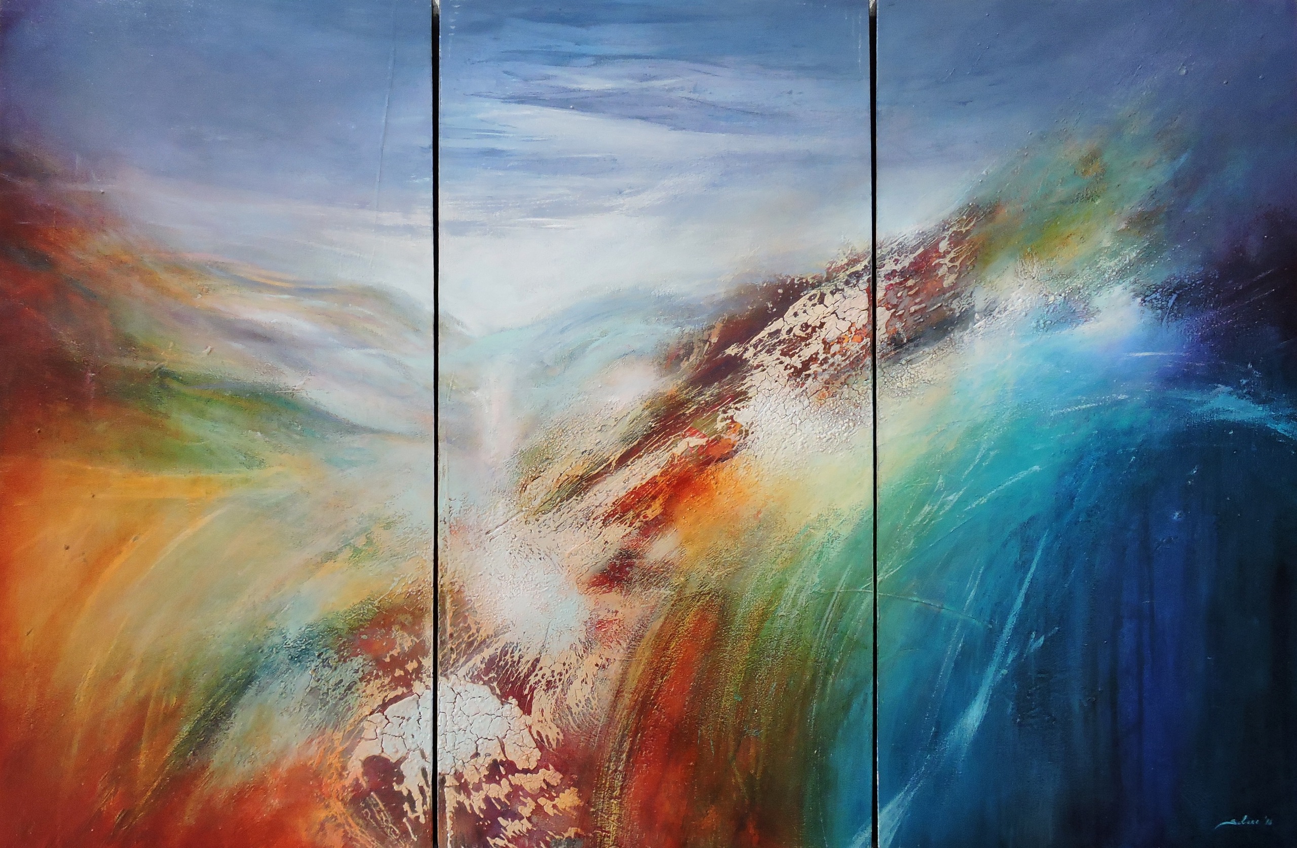 De kunstenaar legde haar ziel in dit drieluik met een wervelwind van emoties. Ze gebruikte acrylverf om een abstract universum te creëren dat de toeschouwer uitnodigt voor een transcendente reis. De levendige combinatie van warme en koele tinten danst over het doek en biedt een visuele symfonie van verkenning en verwondering. Dit werk straalt een aura van mysterie en energie uit in elke ruimte, prikkelt de verbeelding en wekt de zintuigen. De zijkanten van elk paneel zijn zwart geverfd en het is klaar om op te hangen. Het schilderij is voorzien van een glanzende vernislaag om het te beschermen tegen uv-licht en de intensiteit van de kleuren jarenlang te behouden. Voor meer informatie of foto's van dit schilderij kunt u contact met haar opnemen via selenesart@gmail.com.