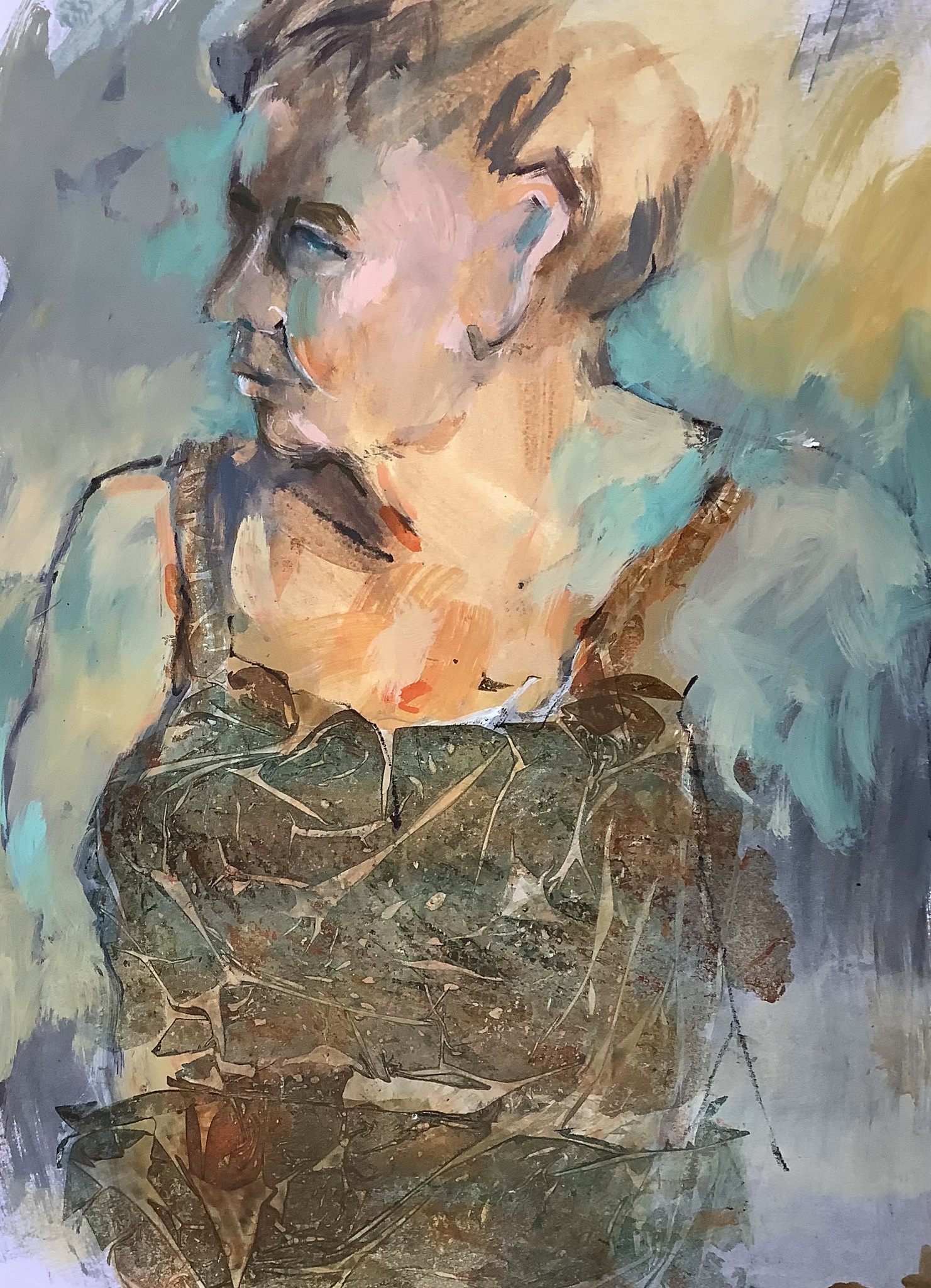 Een keer per maand schilderen wij naar naakt en gekleed model met een paar bevriende kunstenaars ,deze maakte ik tijdens zo,n sessie .Ik vind hier vooral de lichtval erg mooi. Het werk wordt zonder lijst aangeboden in de webshop