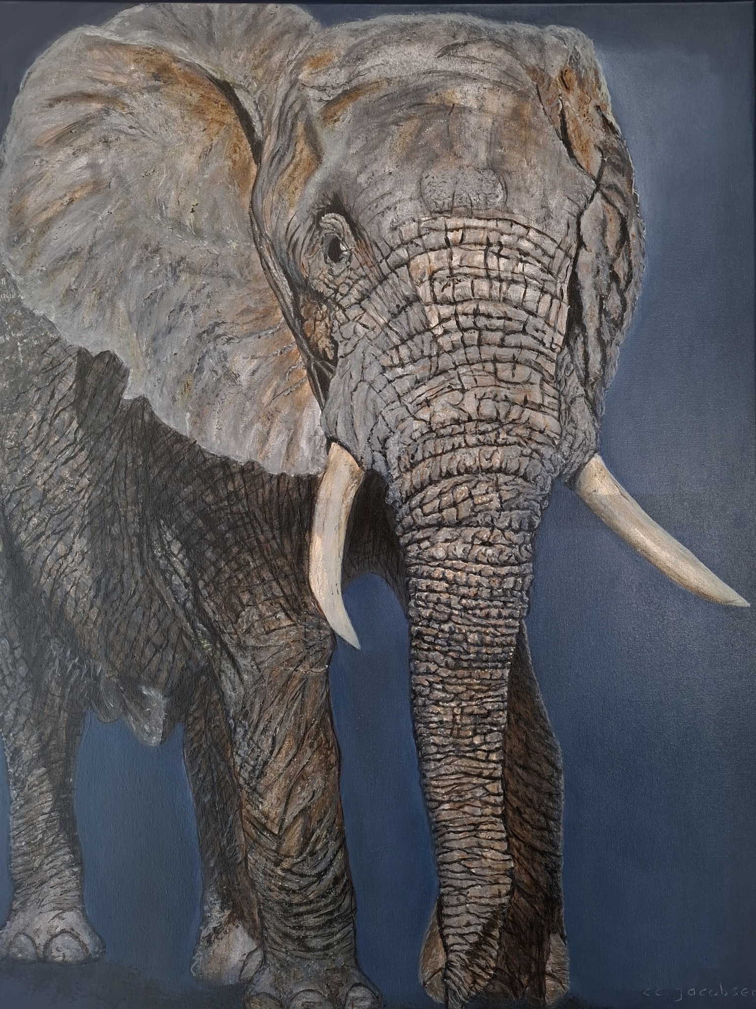 Olifant in acrylverf 60 X 80 cm. Wordt met in achtergrond kleurige baklijst verzonden.