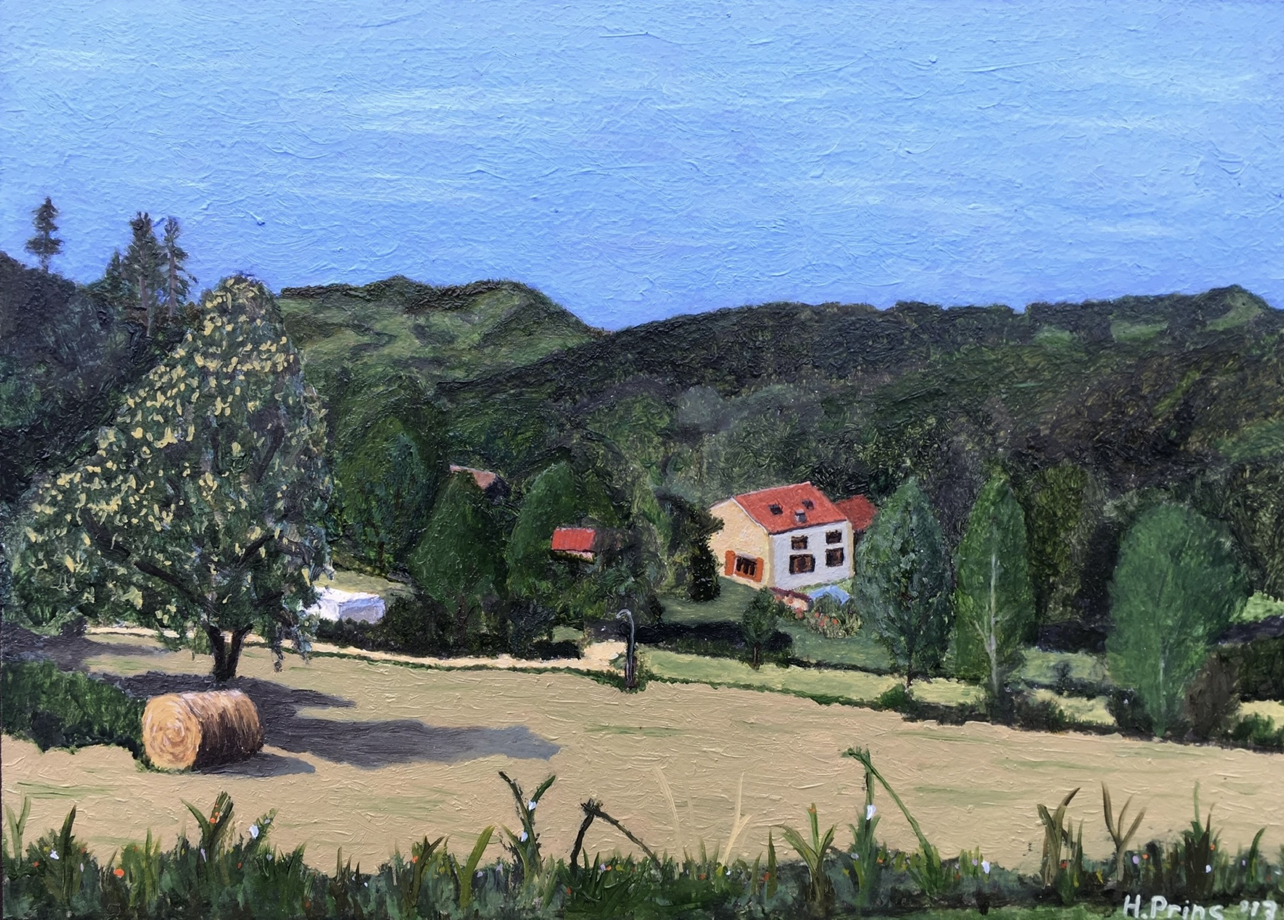 Vakantie-schilderij van camping Millefleurs. Geschonken aan de toenmalige eigenaars van de camping Olieverf op masonite
