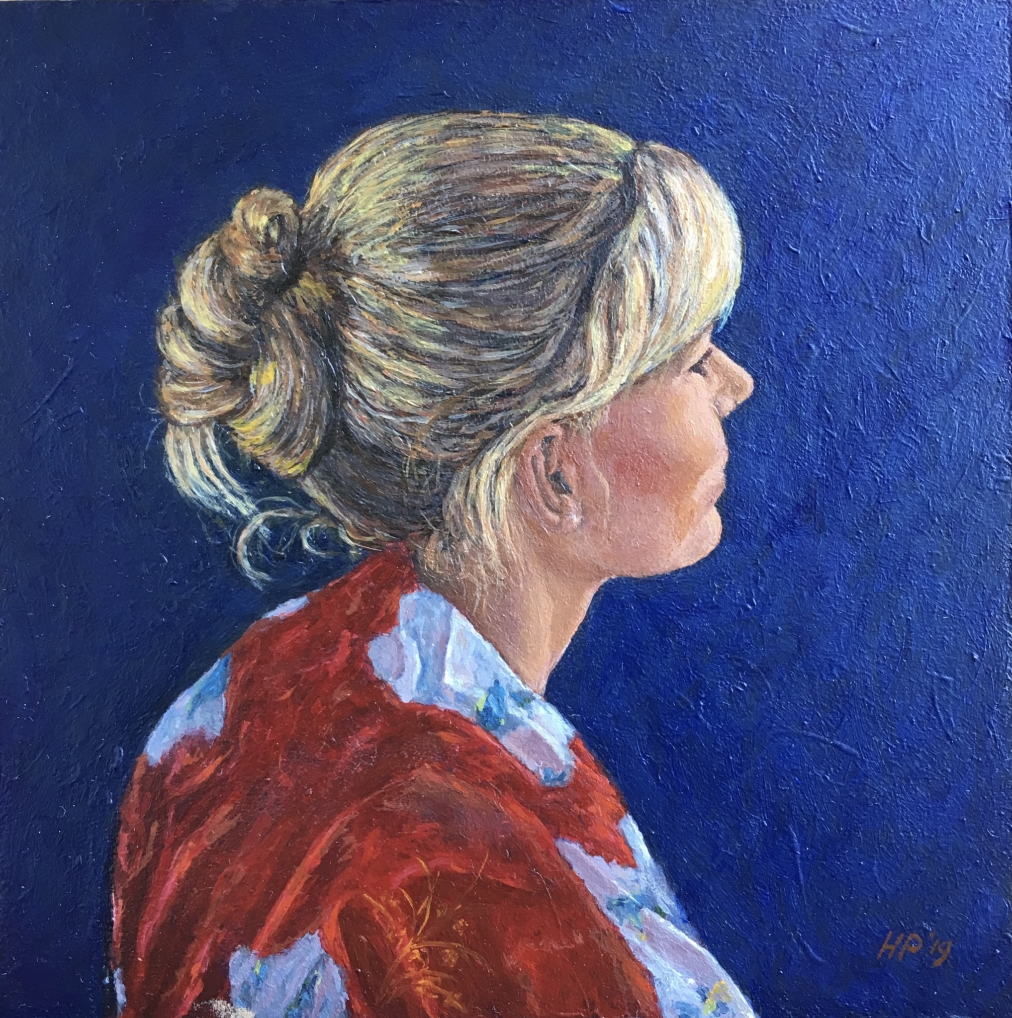 Portret van mijn eerste schilderlerares Nicole van der Veen-Kerssies, op basis van een foto van kunstschilder Gijs Kos Olieverf op masonite