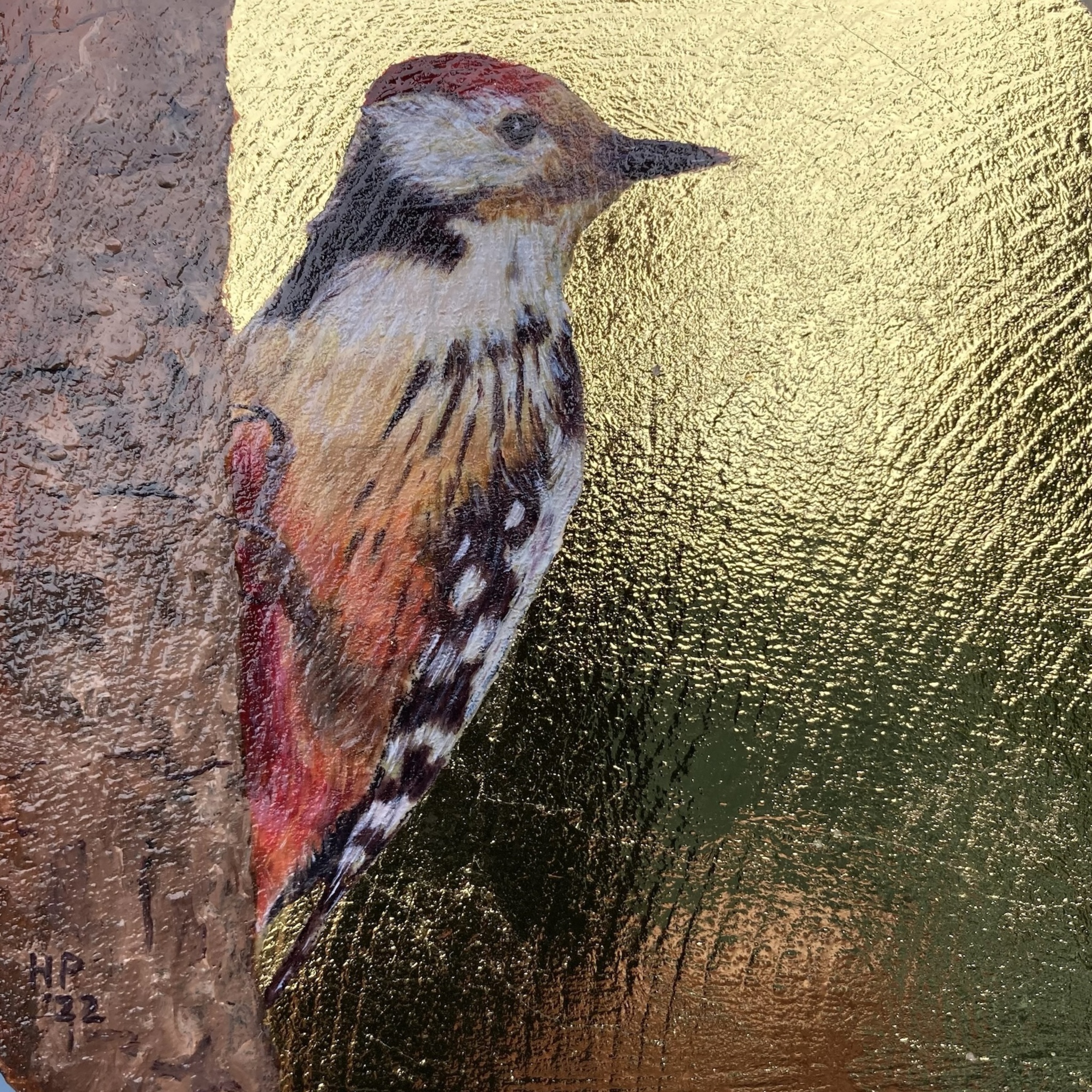 Miniatuurschilderij voor mijn deelname aan de miniatuurtjes-tentoonstelling "Visitekaartjes" bij Galerie Paterswolde in 2022 Geschilderd op een houten paneeltje, met als achtergrond goudkleurig slagmetaal