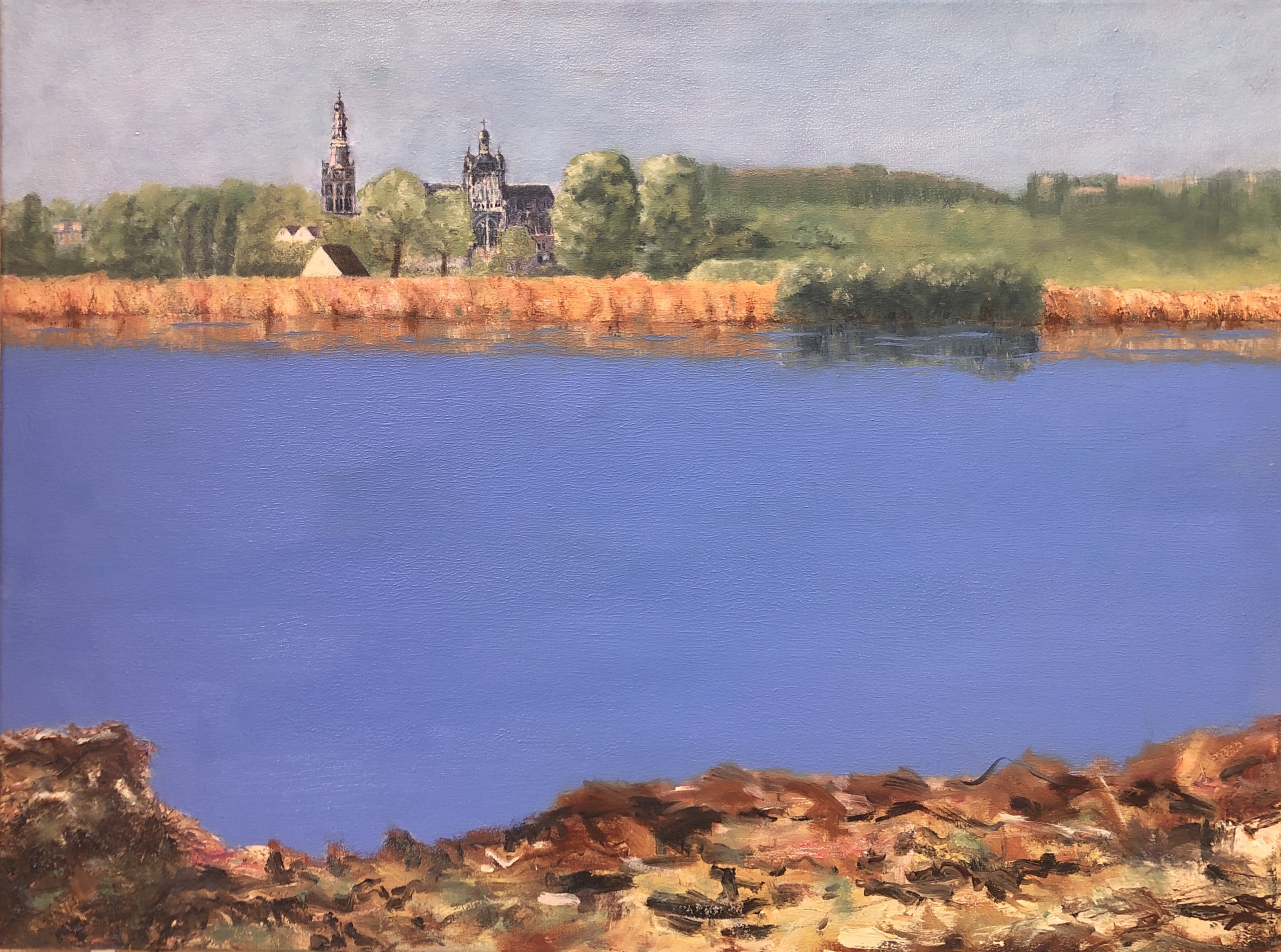 Doek Mooi Vanuit Het Kathedraal Bosch Broek Den Jans Bossche #blauw #olieverf #landschap #uitzicht #oker #bruin #roze #het #groen #riet #’s-hertogenbosch #sint #skyline #natuurschoon #landschapsschilderij