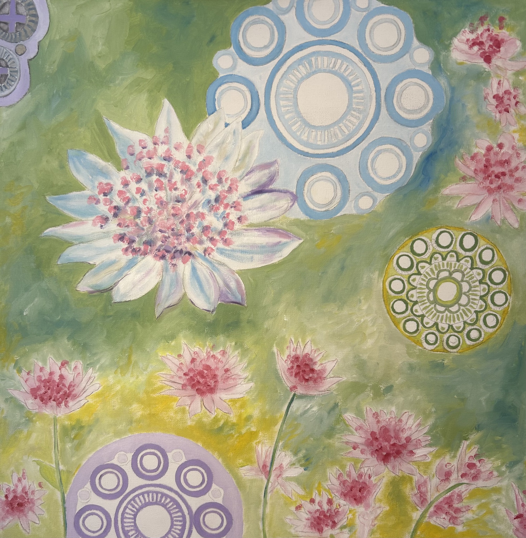 Compositie van Zeeuwse Knopjes en bloemen Astrantia, olieverf, potlood