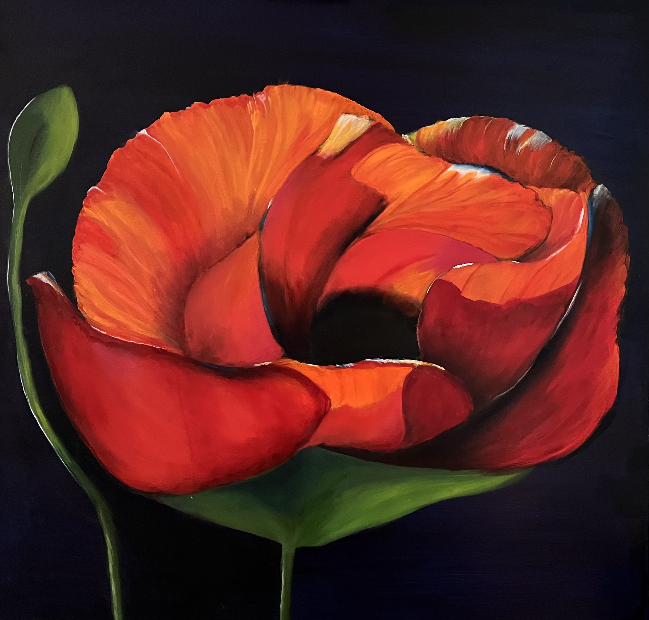 Poppies are everywhere. The flower is a symbol of comfort in times of war. When everything is bombed to pieces, the poppy will be the first to grow again everywhere in the world. I especially wanted to show the details of the flower in enlarged form, as well as the comfort we can so much need in these turbulent times. The poppy is a wild flower and is sometimes even considered a "weed." We must realize that the nectar of this flower is the bees' number one priority. That's where life begins, pollination, the creation of fruits for our own diet.